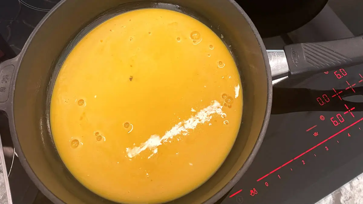 Для начала я отделила желтки от белков. К желткам добавила сливки и перемешала в однородную массу.