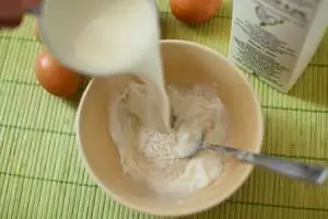 Молоко смешать с мукой,чтобы не было комочков,отдельно добавить воду.