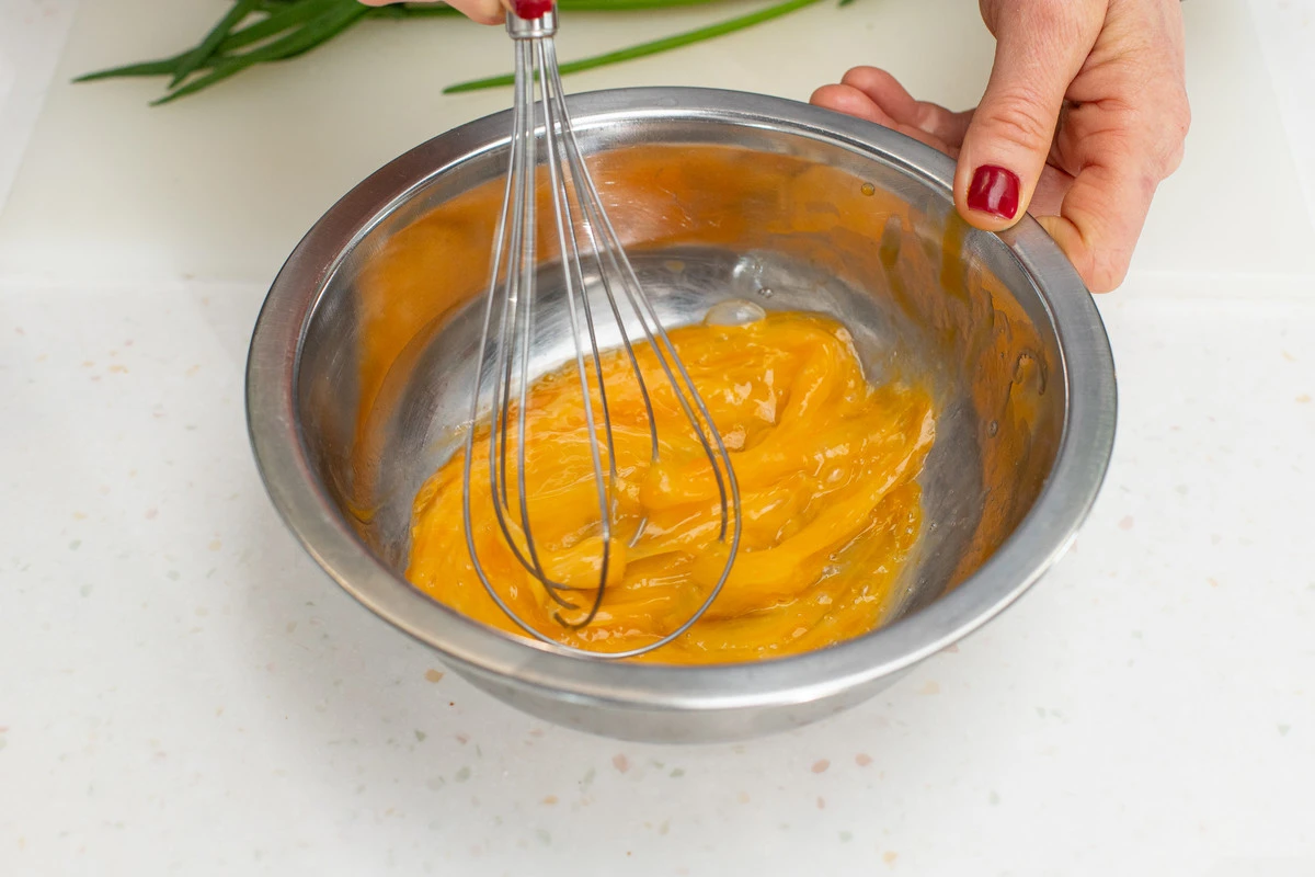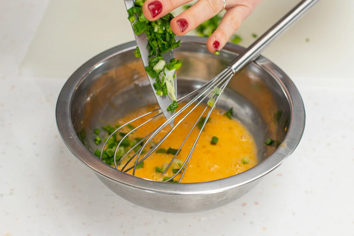 Яйца разбейте в мисочку, слегка взбейте венчиком.