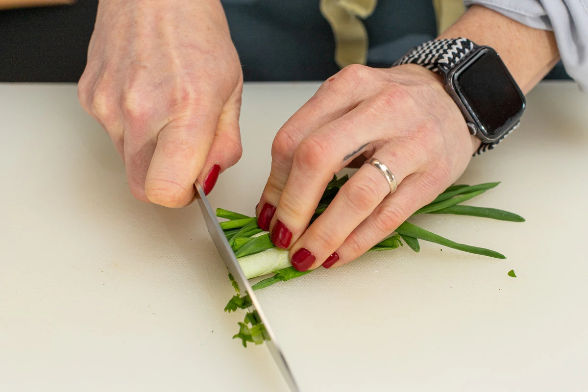 Готовый омлет скрутите в рулет и разрежьте на кусочки.