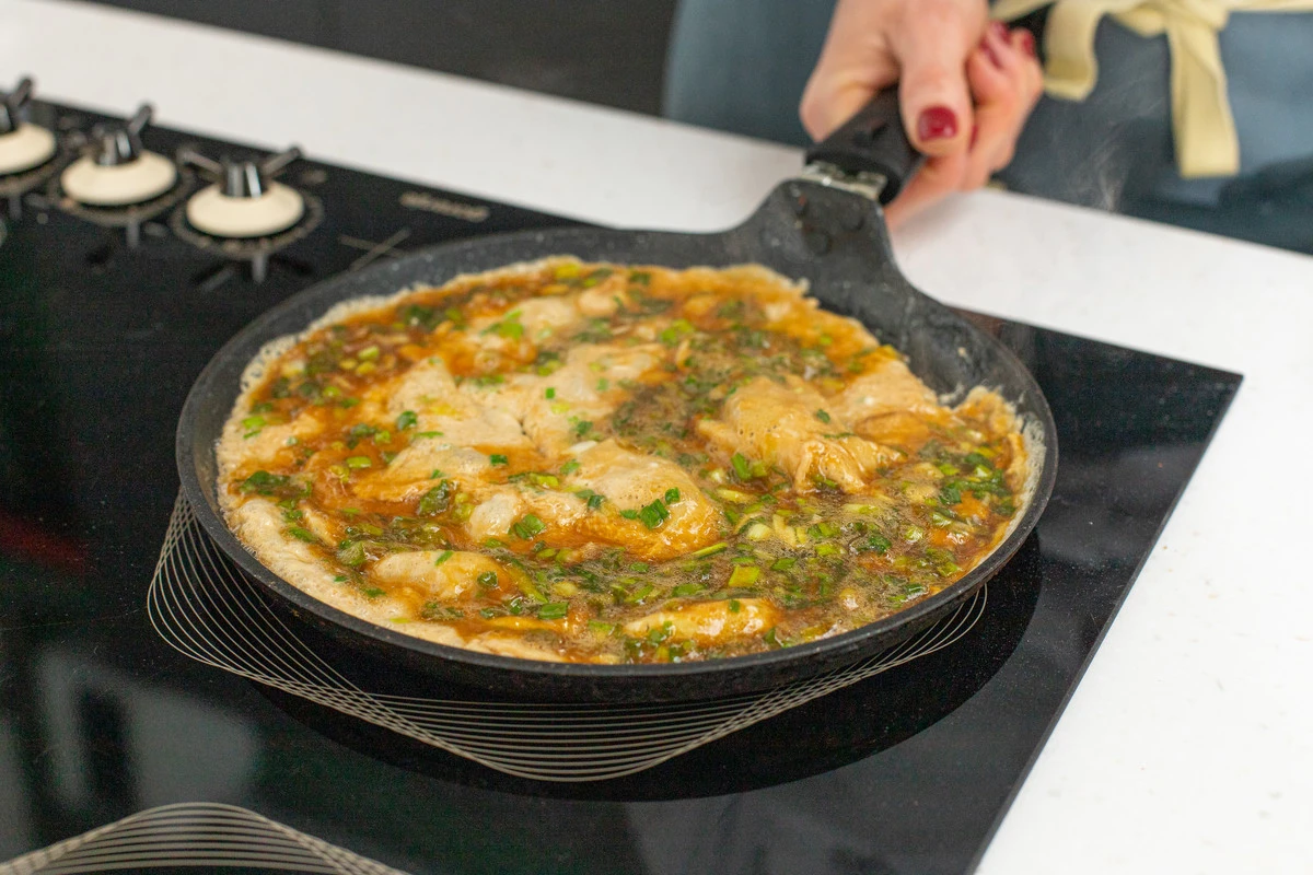 Пожарьте омлет на большой сковороде на кунжутном масле. Если дно сковороды не очень широкое, то пожарьте всю смесь в два приёма.
