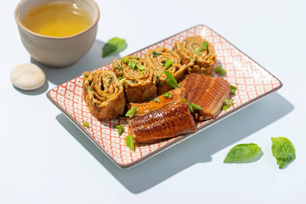 Для поклонников азиатской кухни приготовили необычный омлет — с соевым соусом и угрём в качестве гарнира.