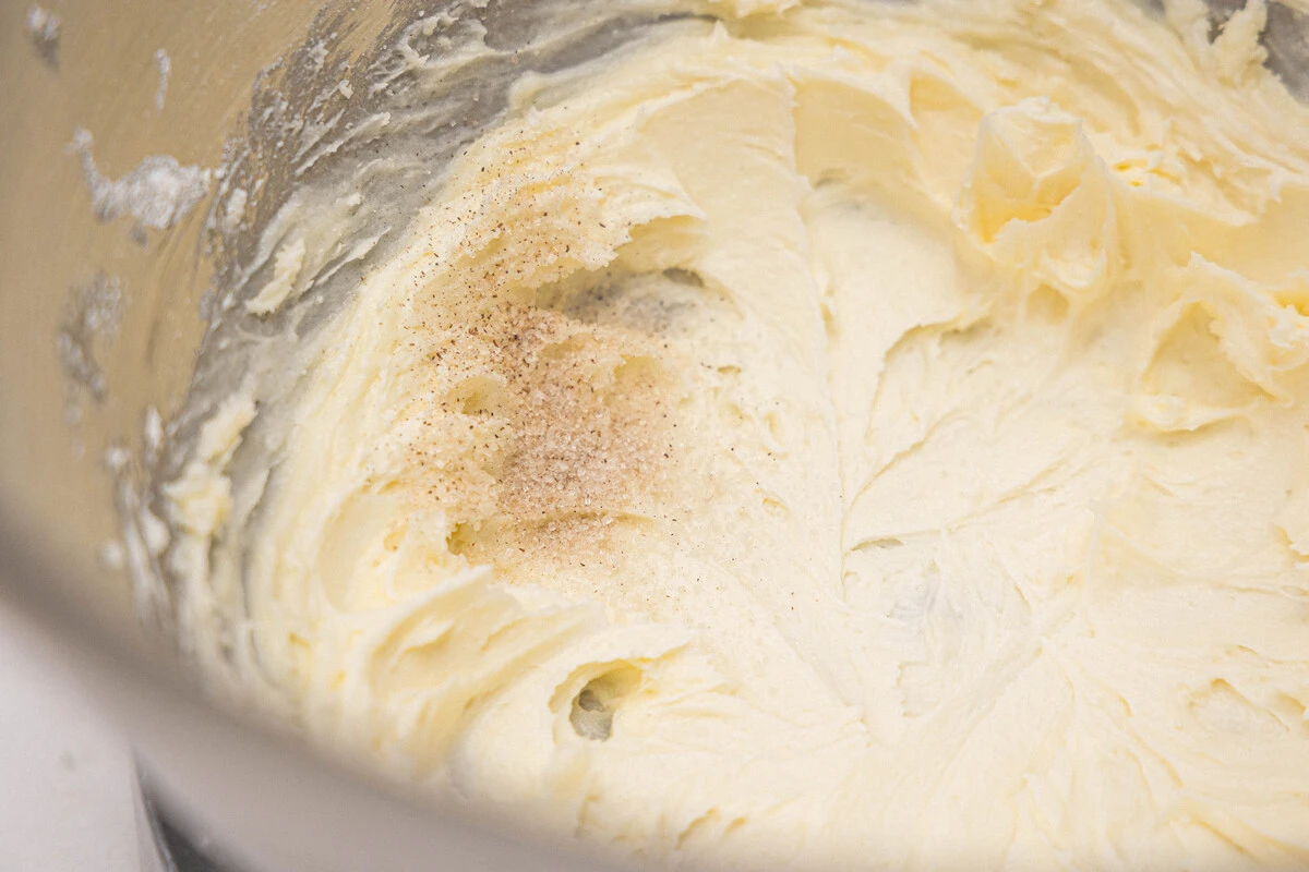 В сливочное масло комнатной температуры добавьте сахарную пудру, ванильный сахар, соль и взбейте до пышной белой массы.