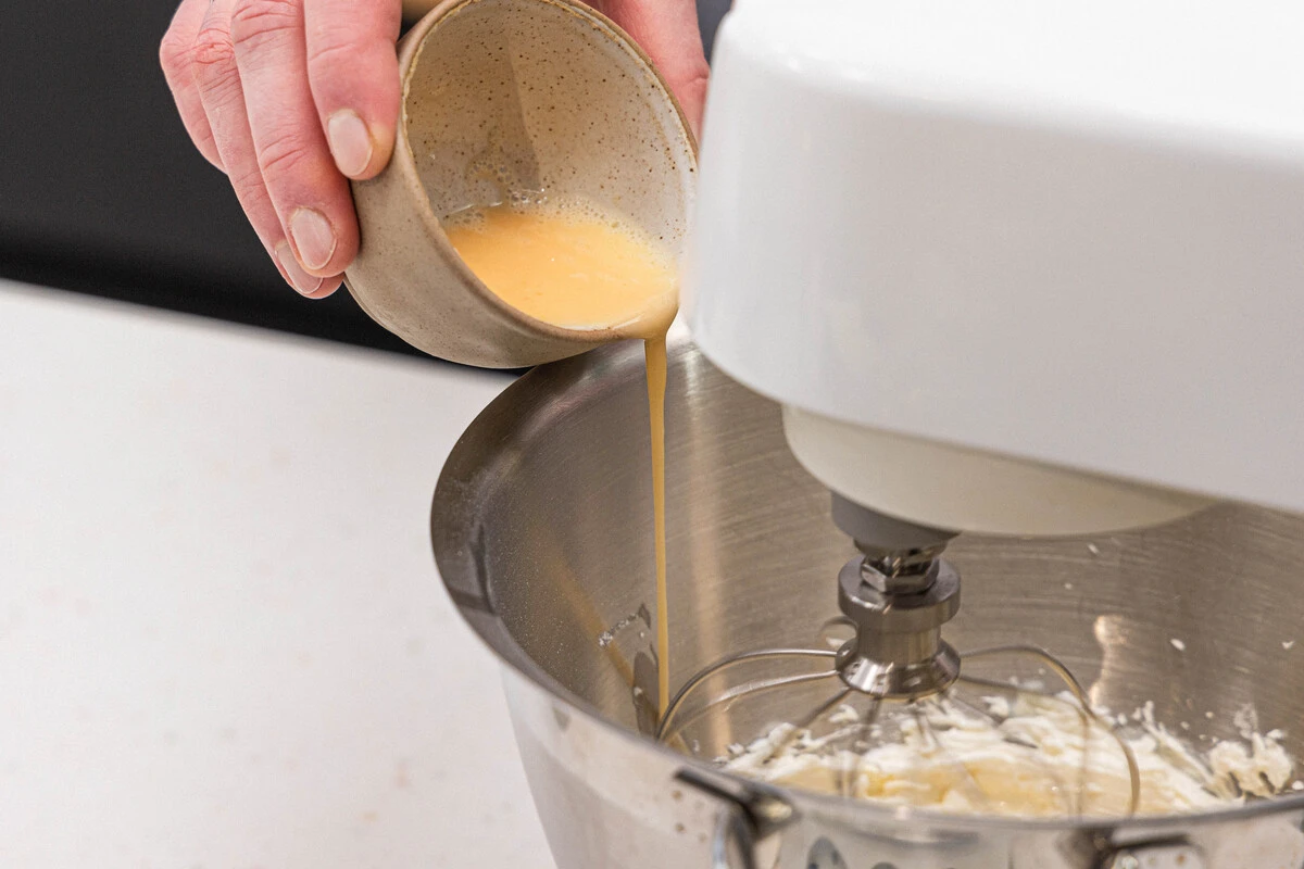 Яйцо взбейте вилкой или венчиком до лёгкой пены и добавьте к масляной смеси, не переставая взбивать.