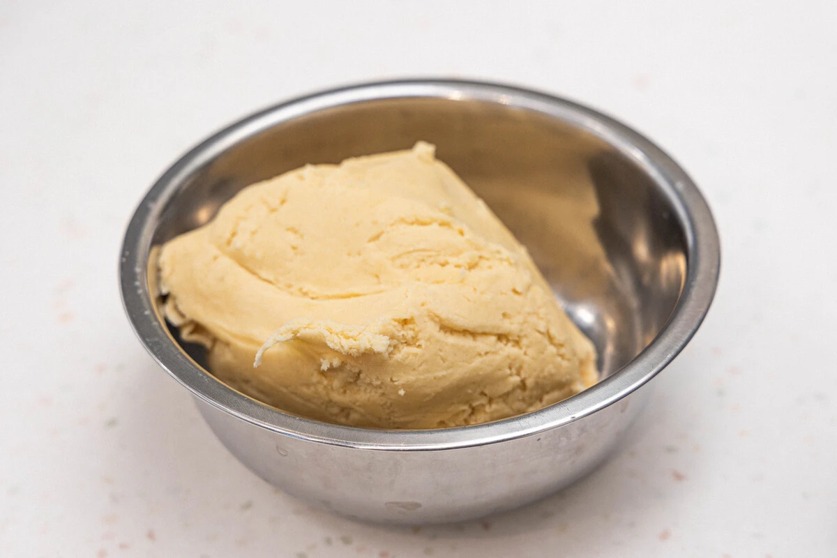 Всыпьте муку и быстро замесите тесто. Заверните в плёнку и уберите в холодильник на полчаса.