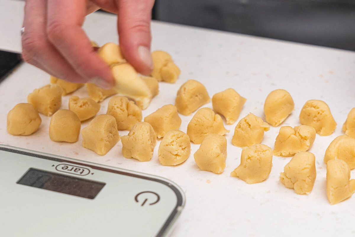 Нарежьте колбаску на небольшие кусочки по 15–17 г. Точный вес зависит от вашей формы-орешницы.