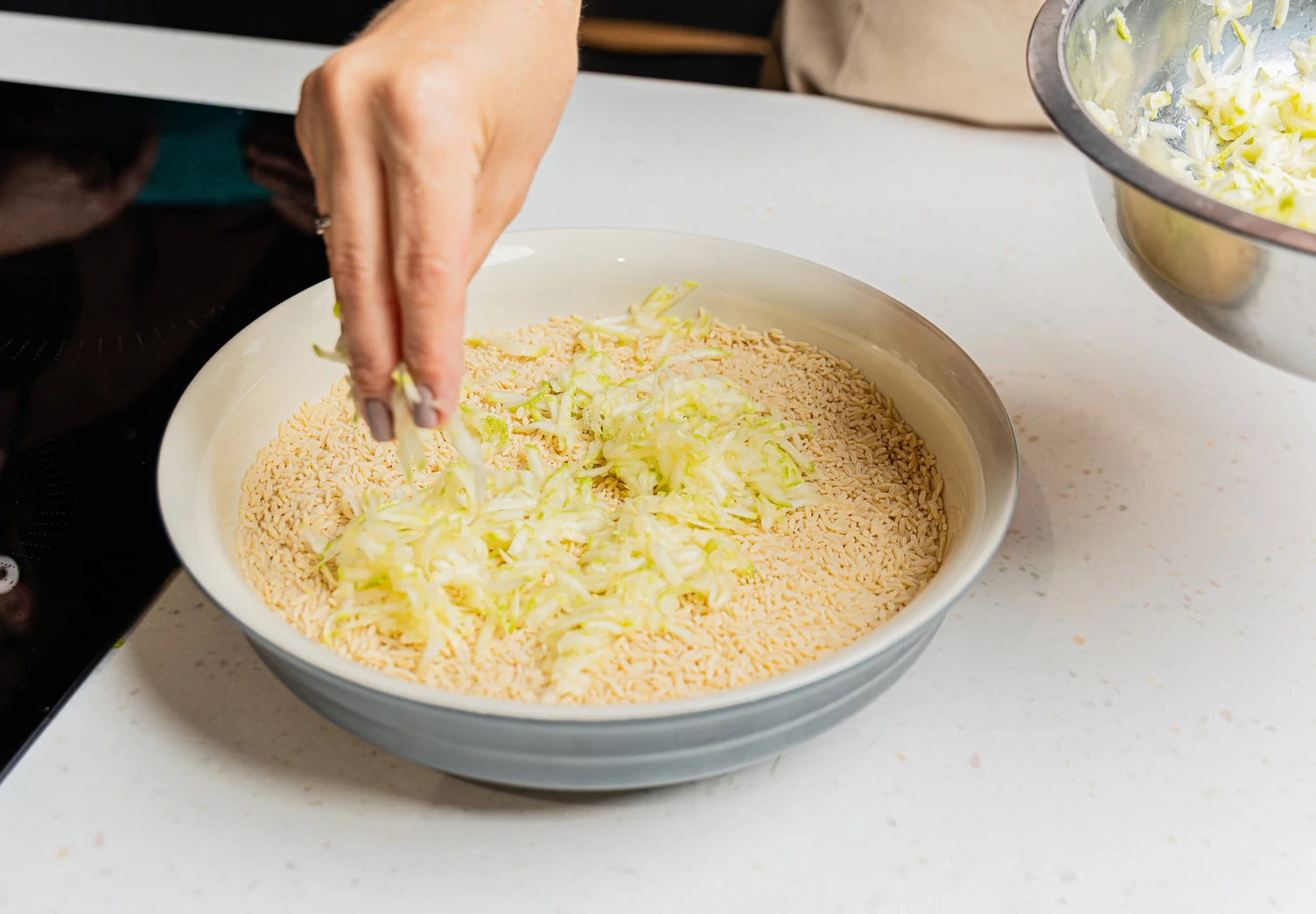 Форму для запекания смажьте оливковым маслом, насыпьте в неё орзо, сверху равномерно распределите кабачки.