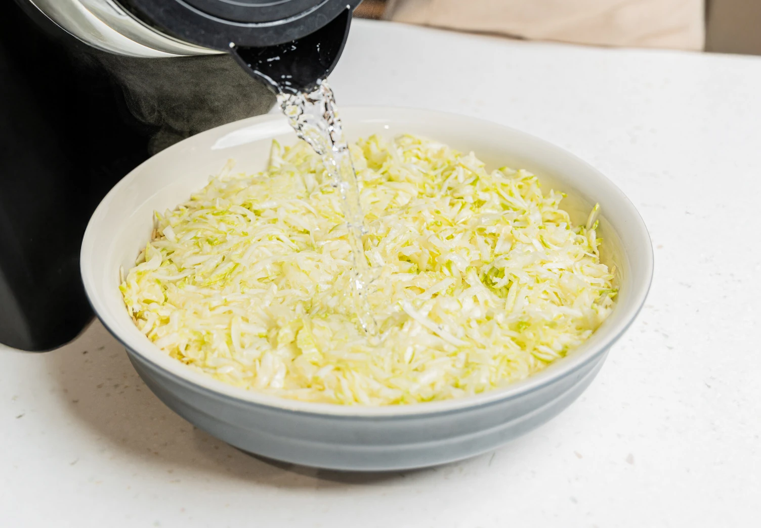 Кабачок натрите на средней тёрке и слегка отожмите. Креветки разморозьте по инструкции на упаковке.