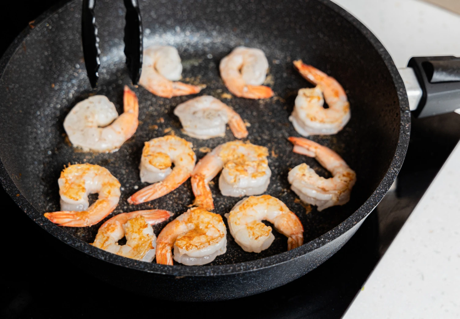 Пока готовится паста, разогрейте сковороду с оставшимся оливковым маслом и обжарьте на ней креветки, посолив и поперчив их по вкусу.