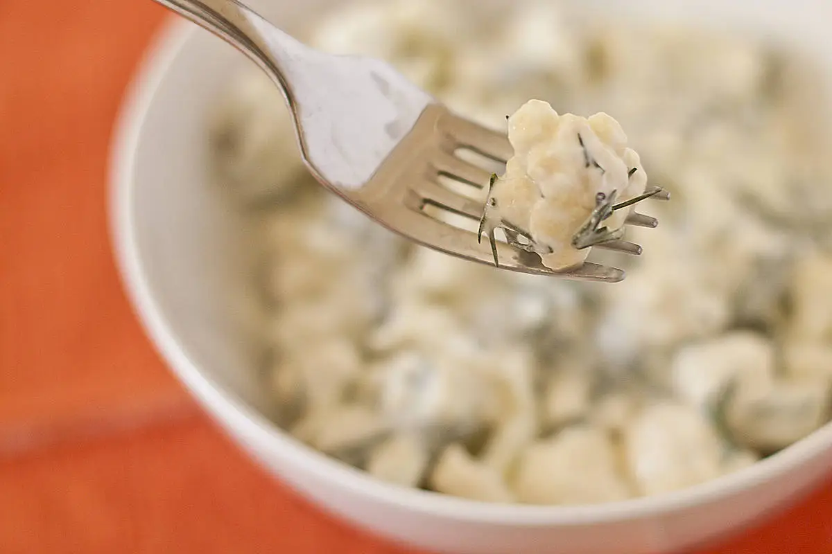 Капусту порежьте кусочками размером с вишню, укроп мелко нарежьте, смешайте все с простоквашей или мацони, посолите по вкусу.
