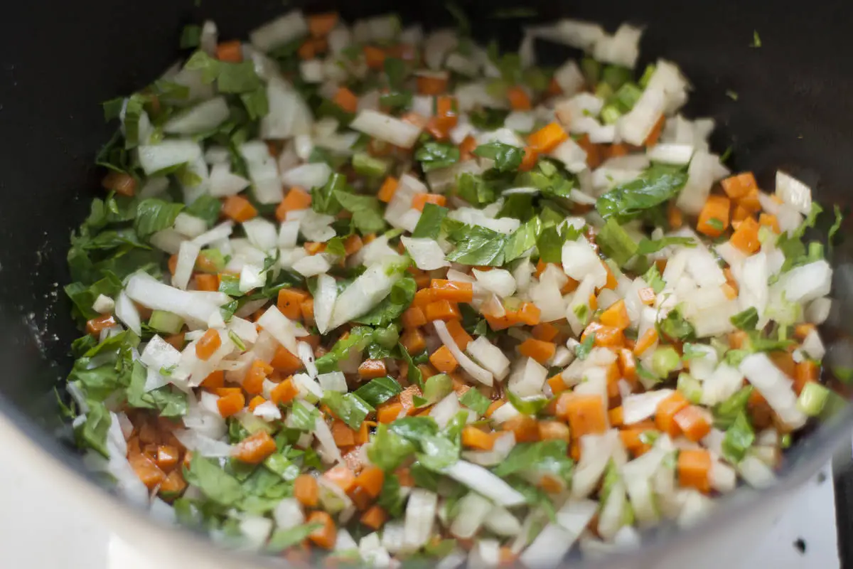 В оставшемся масле обжарьте морковь, затем добавьте лук и сельдерей, жарьте еще около 5-ти минут, помешивая, затем влейте вино и дайте ему выпариться.