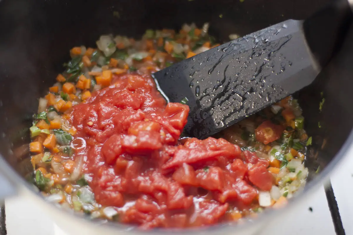 Добавьте помидоры, перемешайте, выложите мясо к овощам, добавьте бульон, посолите и томите на медленном огне около двух часов, пока мясо не станет мягким.