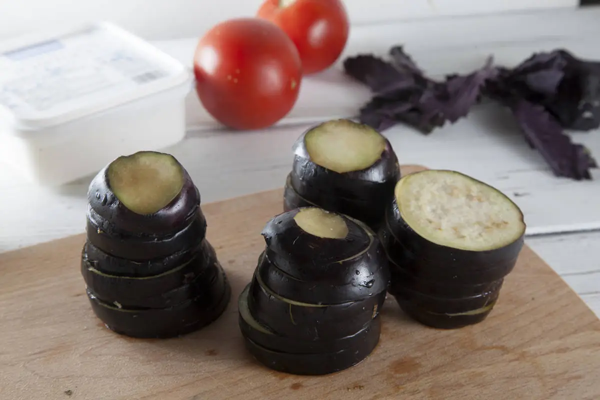 Баклажаны нарежьте кружочками толщиной около 1 см, тщательно посолите и сложите под гнет, оставьте на 10 минут. Слейте выделившийся сок и обжарьте кружочки на оливковом масле с добавлением острого перца, также можно запечь баклажаны в духовке до готовности.