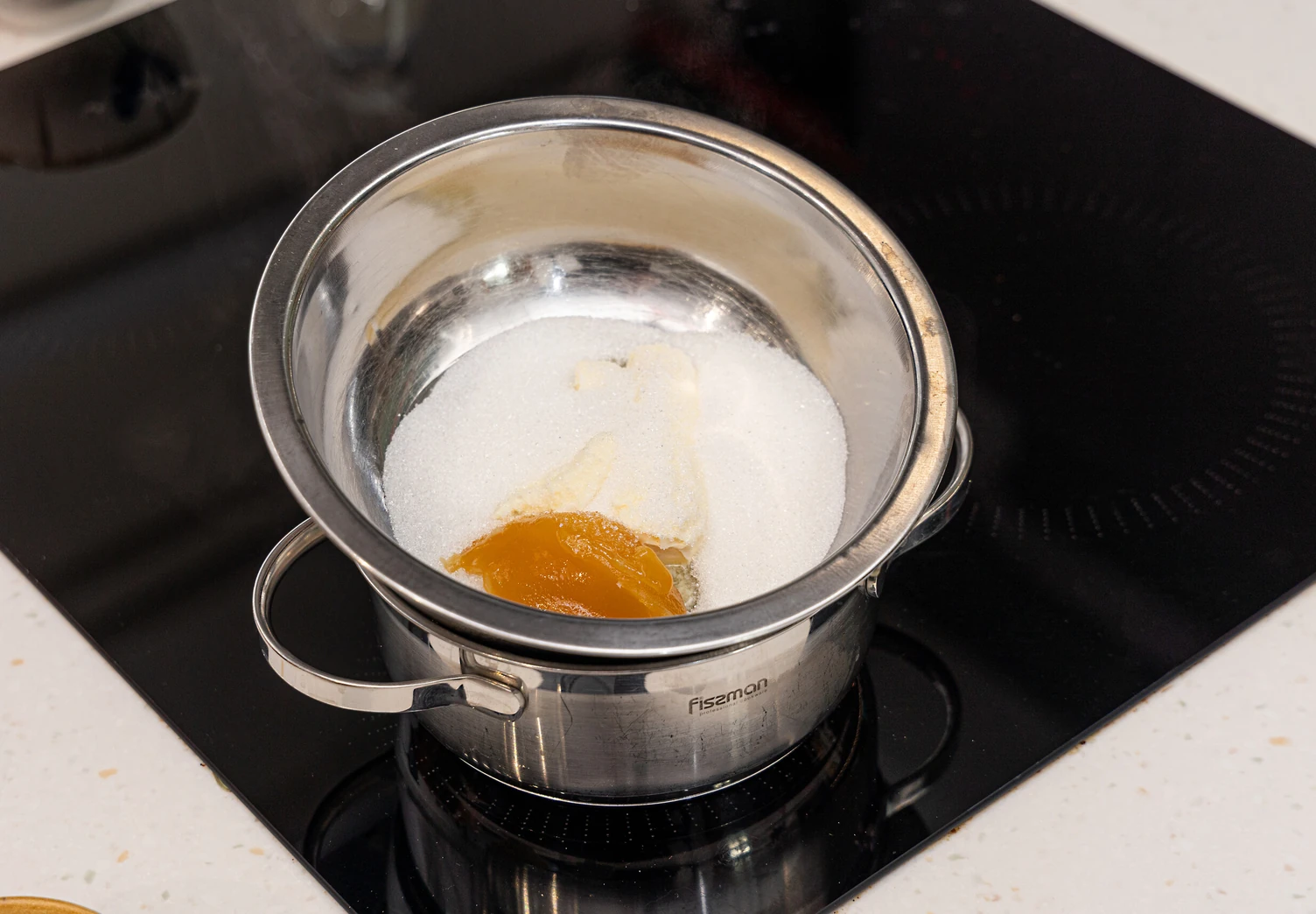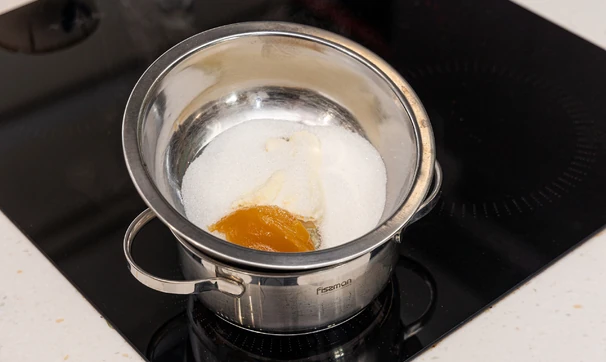 В миске смешайте сливочное масло, сахар и мёд, поставьте нагреваться на водяной бане.