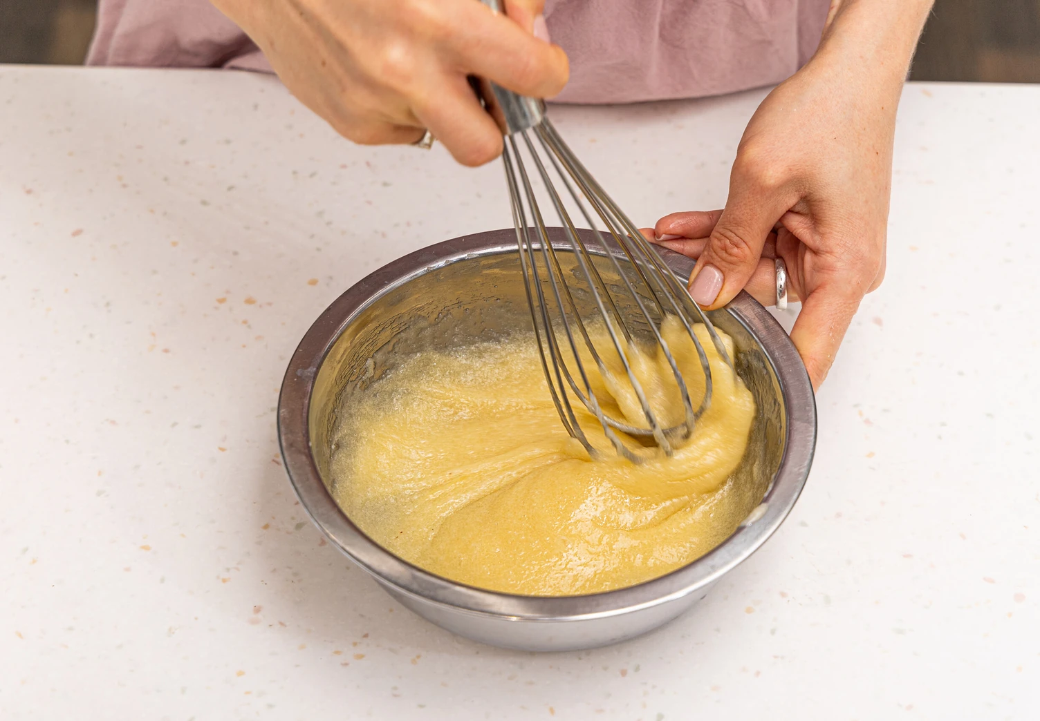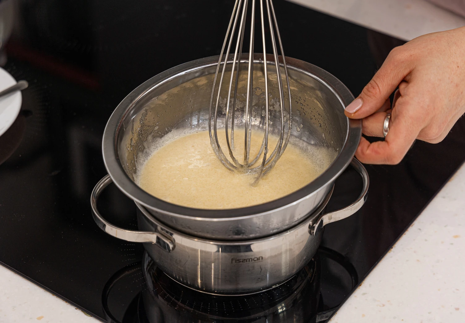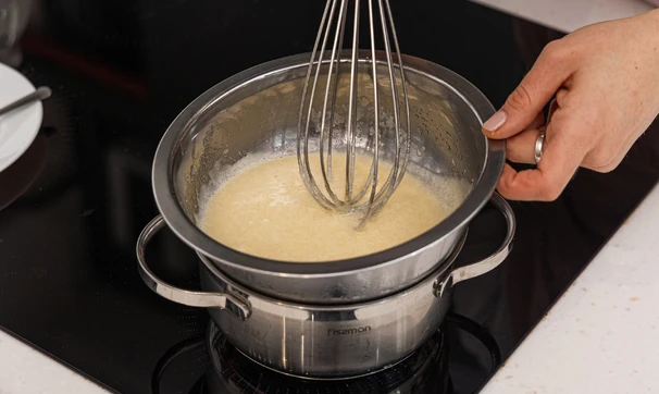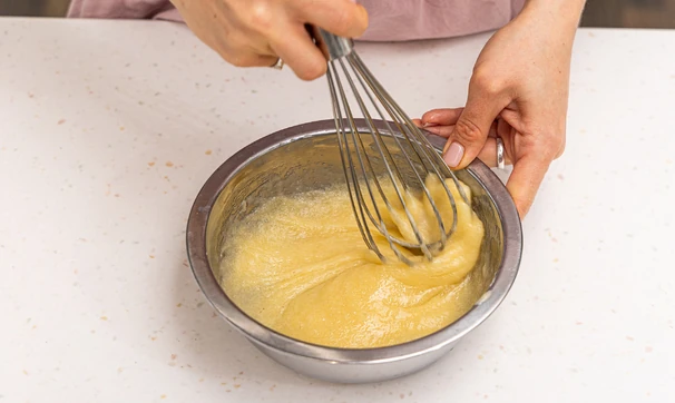 Снимите миску с огня и дайте массе немного остыть. Затем добавьте яйцо и быстро перемешайте до однородности.