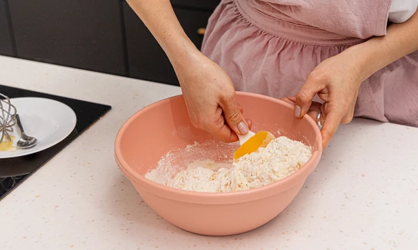Всыпьте в полученную массу муку и быстро замесите пластичное тесто.
