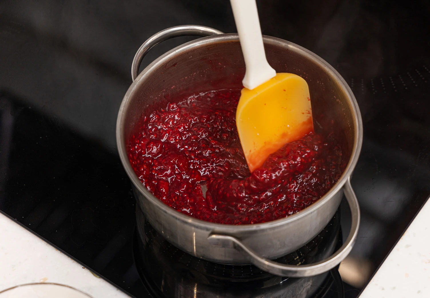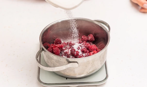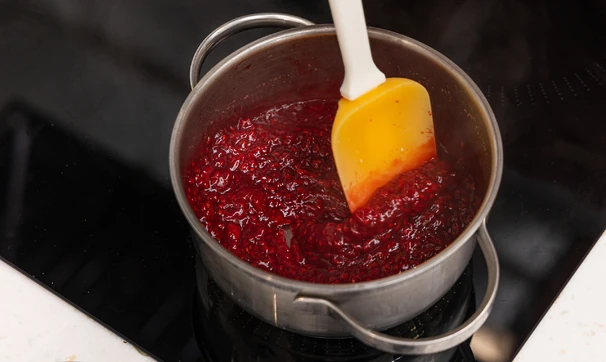 Смешайте крахмал с 2 столовыми ложками холодной воды, чтобы получилась однородная масса без комочков. Влейте её в сотейник к начинке и продолжайте варить до загустения, постоянно помешивая. Готовый малиновый соус уберите в холодильник до полного остывания.