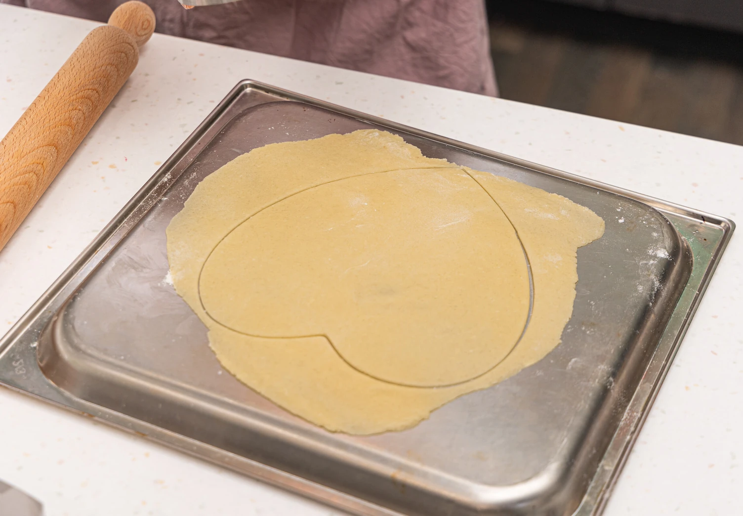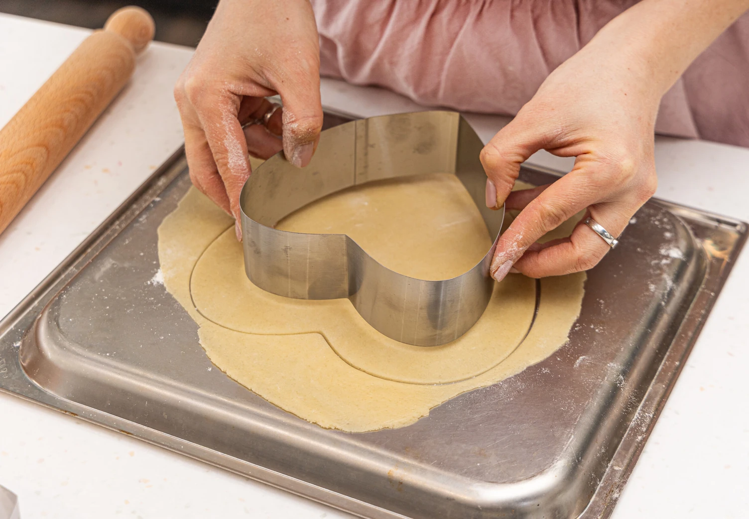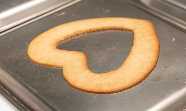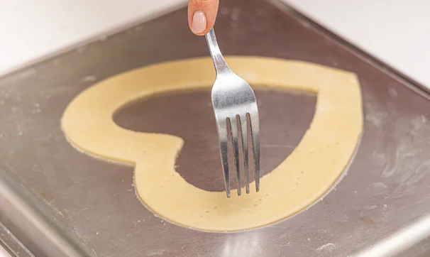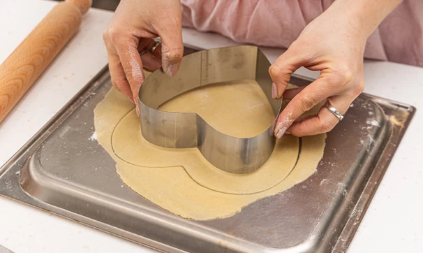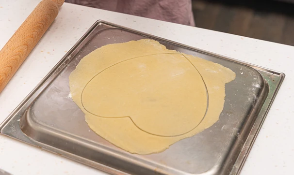 Охлаждённое тесто разделите на 3–4 части — в зависимости от того, сколько коржей вы хотите испечь. Каждую порцию раскатайте в тонкий пласт и вырежьте из него с помощью специальной формы сердце.