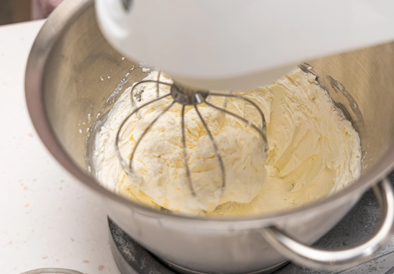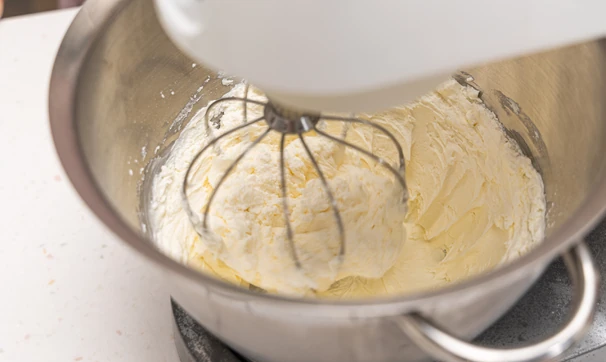Для крема взбейте миксером до пышной однородной массы творожный сыр с пудрой и холодными сливками.