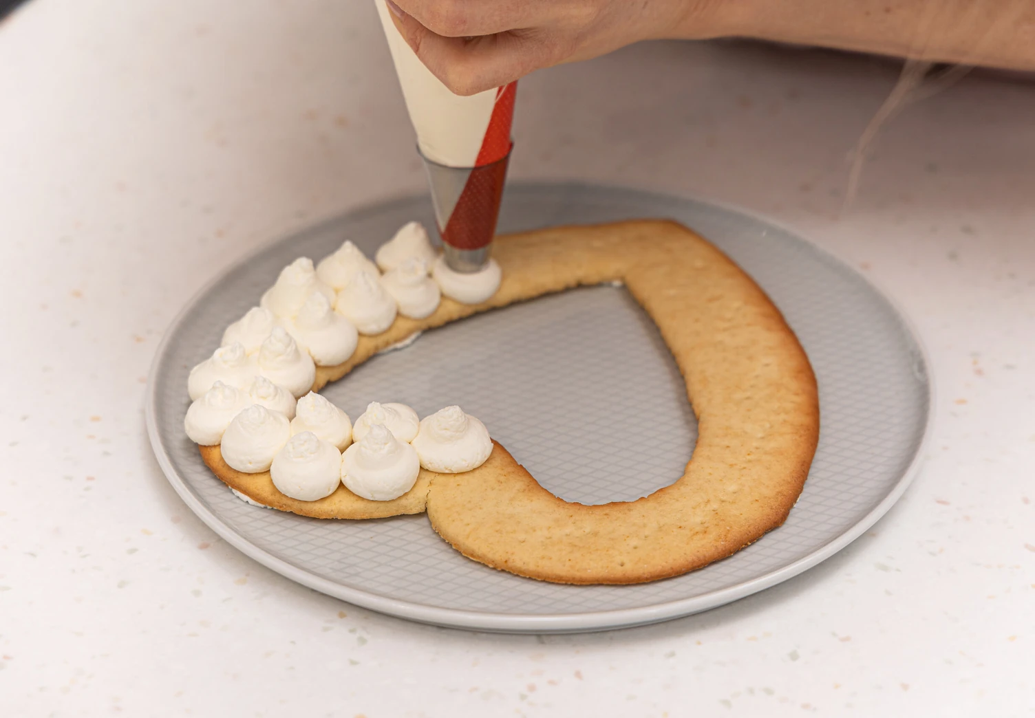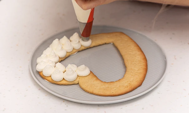 Переложите крем в кондитерский мешок с тонко отрезанным кончиком и отсадите на корж.