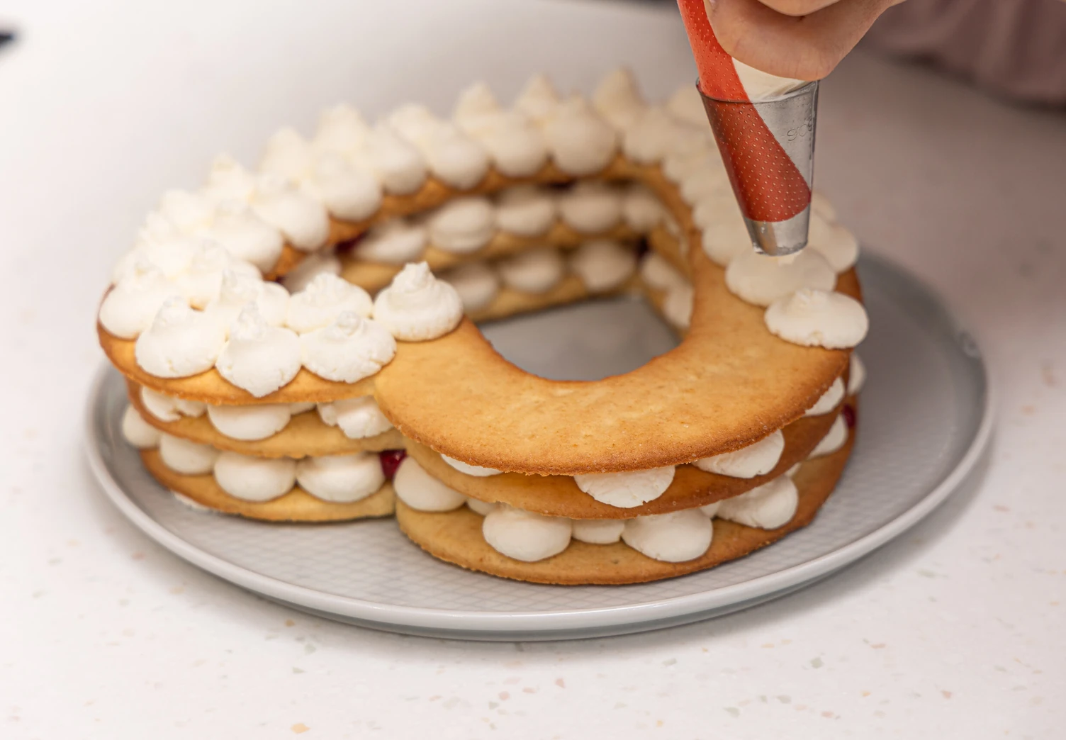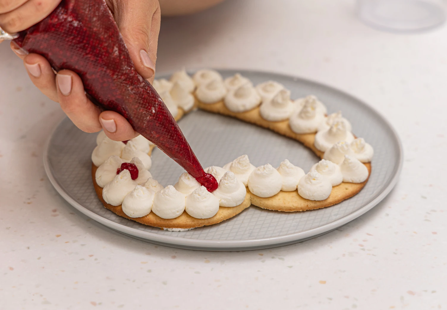 Малиновую начинку также переложите в мешок, отрежьте у него узкий носик, через который аккуратно нанесите ягодную массу поверх кремового слоя.