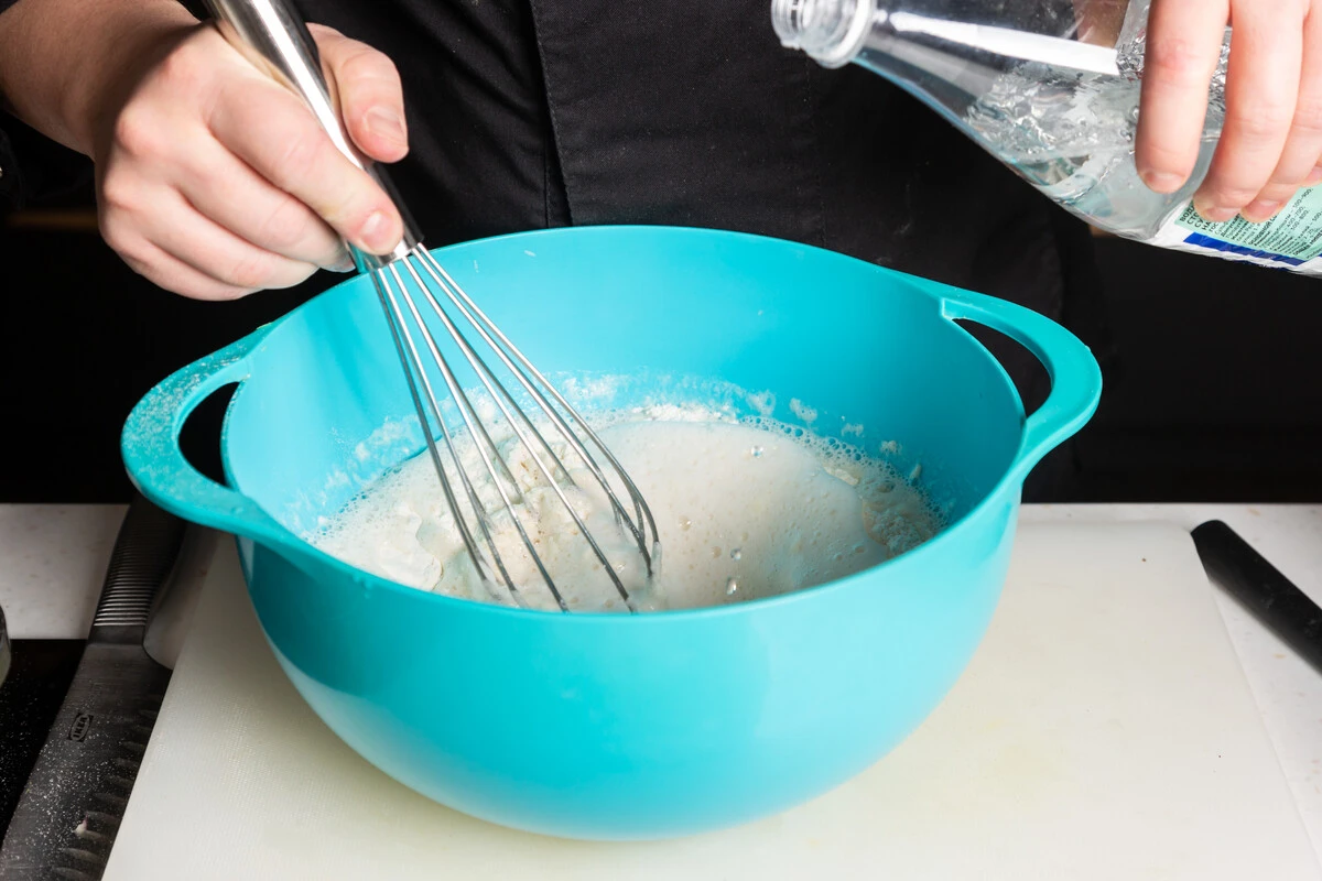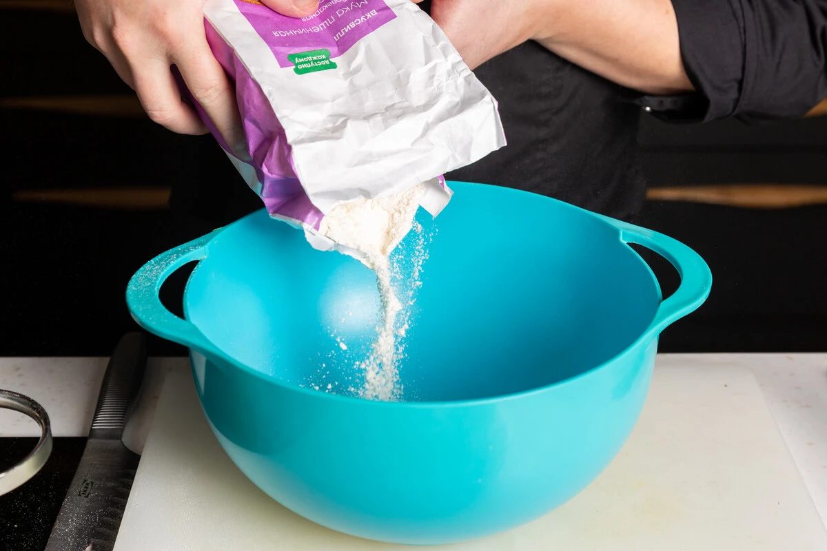 Для кляра смешайте в миске муку, соль и разрыхлитель.