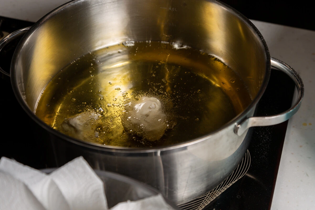 Добавьте минеральную воду, растительное масло и замесите тесто.