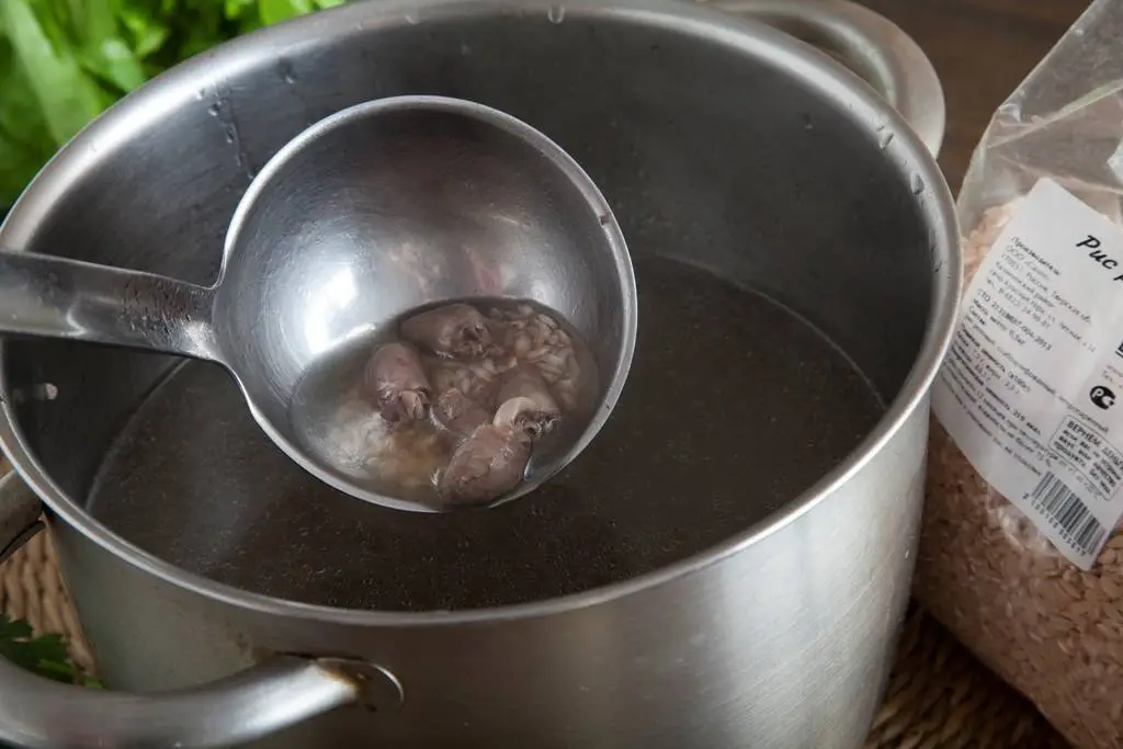 Сердечки промойте, удалите лишний жир, залейте 2 литрами хорошей воды, добавьте щепотку соли, доведите до кипения. Всыпьте промытый рис и убавьте огонь до среднего.