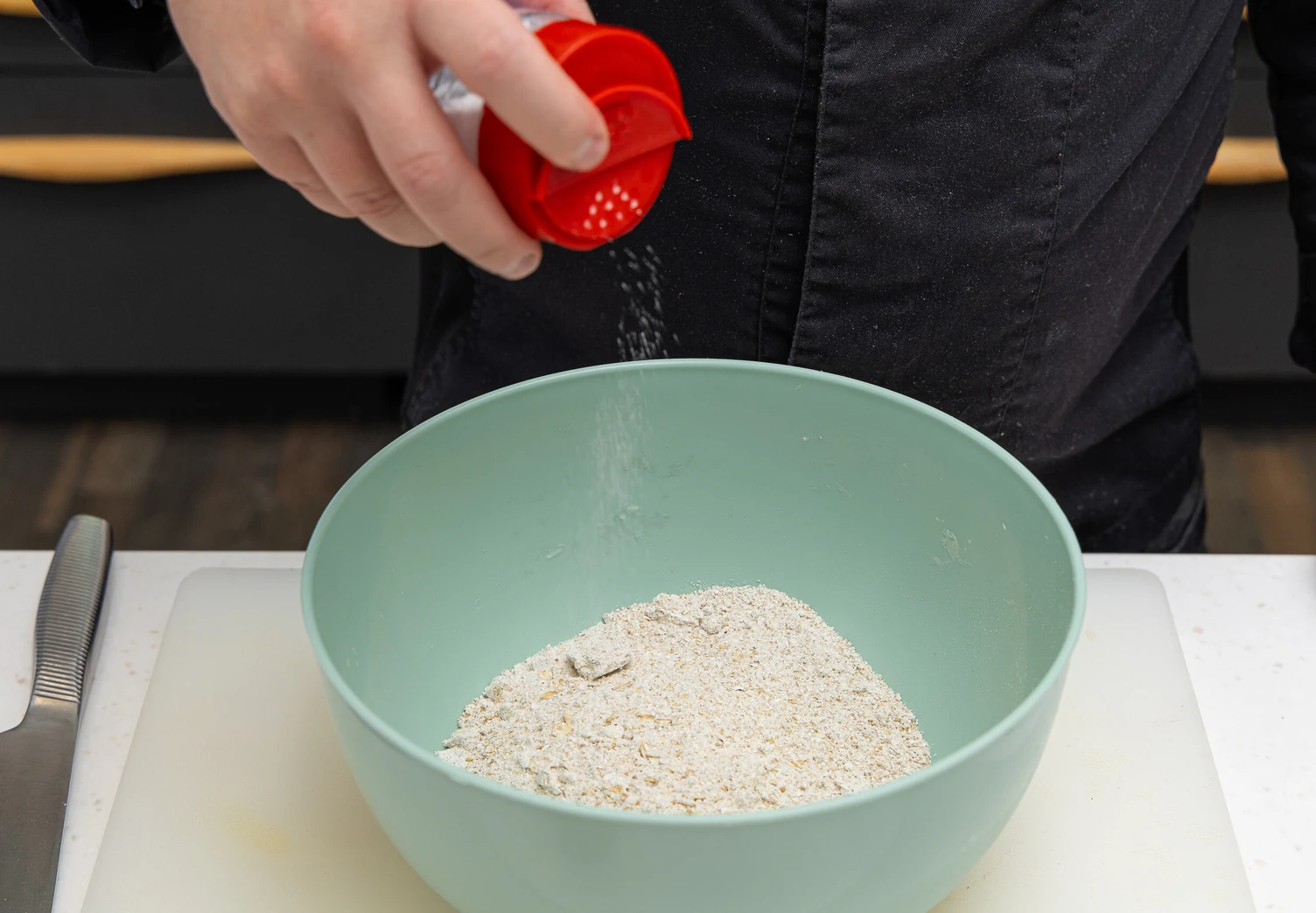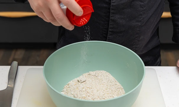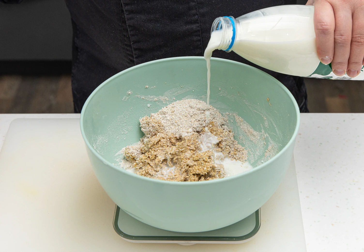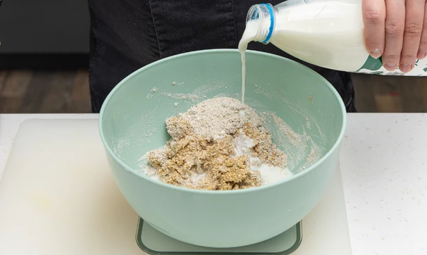 Добавьте столько молока или воды комнатной температуры, чтобы получилось тесто консистенции жидкой сметаны. Если замачивали овсянку на ночь, жидкость можно не использовать или влить совсем немного.