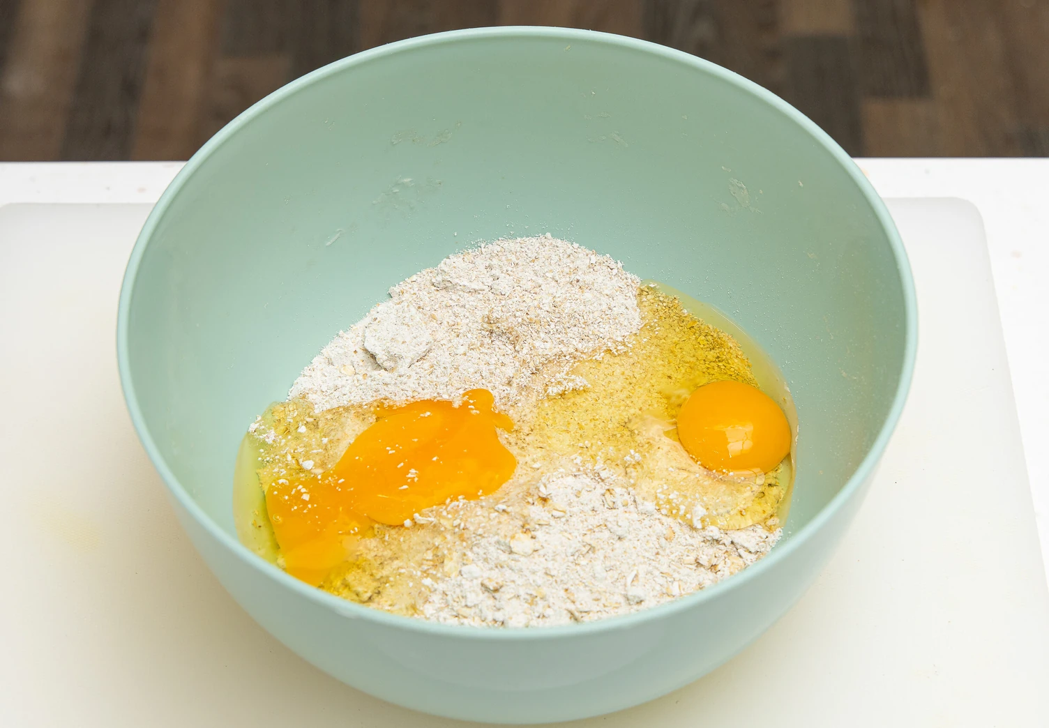Яйцо разбейте в миску с овсянкой и перемешайте эти ингредиенты до однородности.
