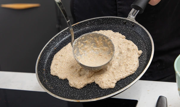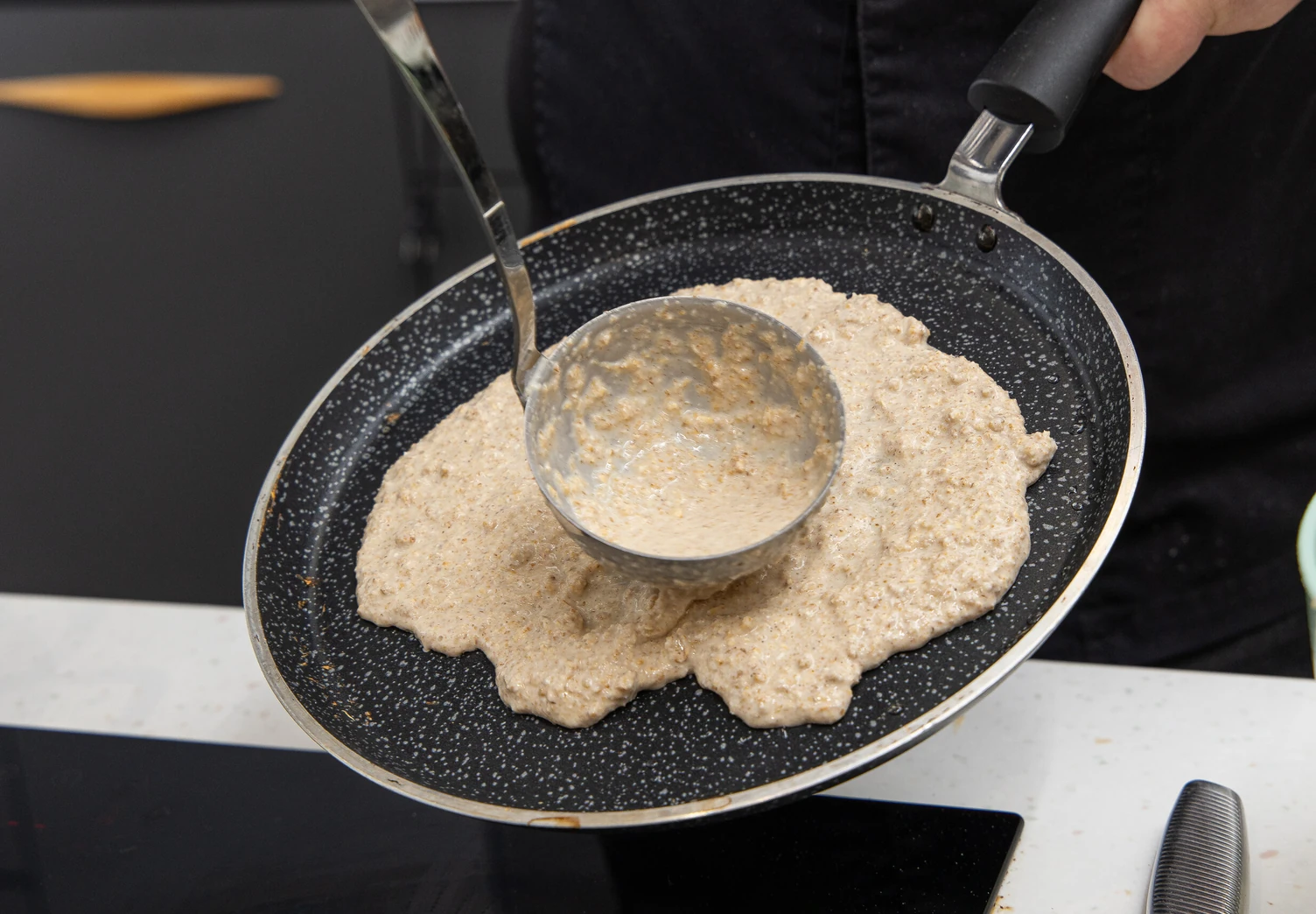 Сковороду разогрейте на сильном огне, смажьте маслом. Налейте на сковороду тесто и готовьте овсяноблины по 4–5 минут с каждой стороны на умеренном огне.