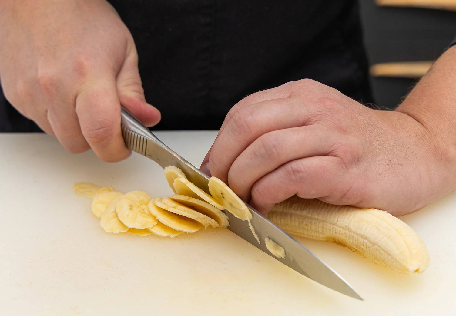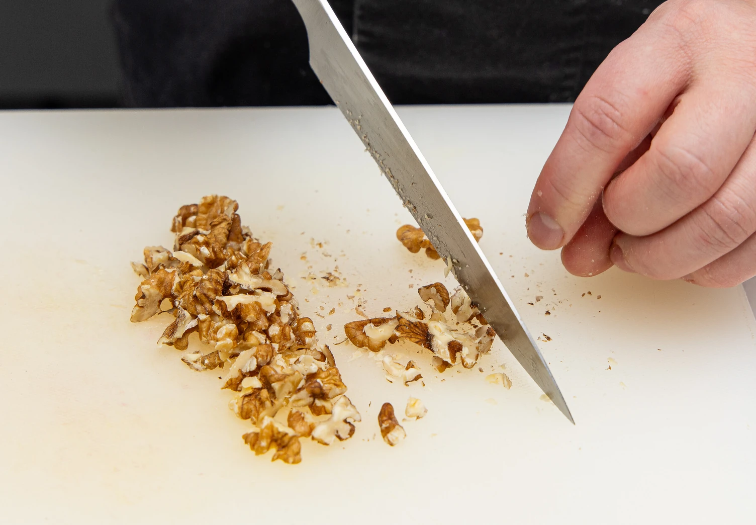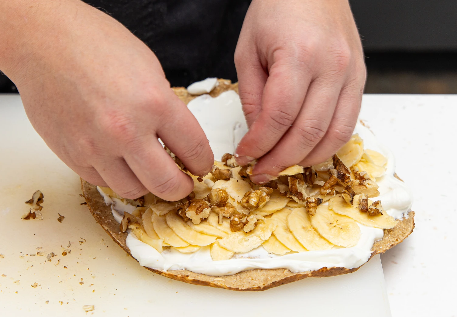 Готовый овсяноблин смажьте творогом, сверху выложите кружочки банана, посыпьте грецкими орехами и подавайте.