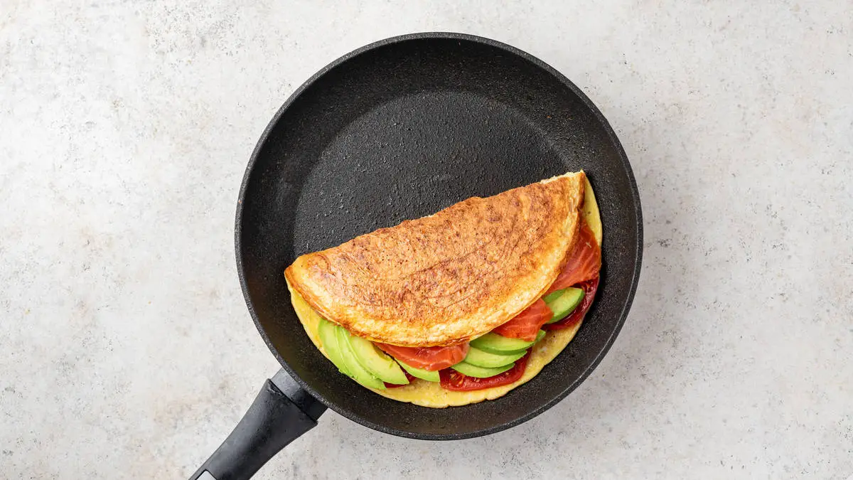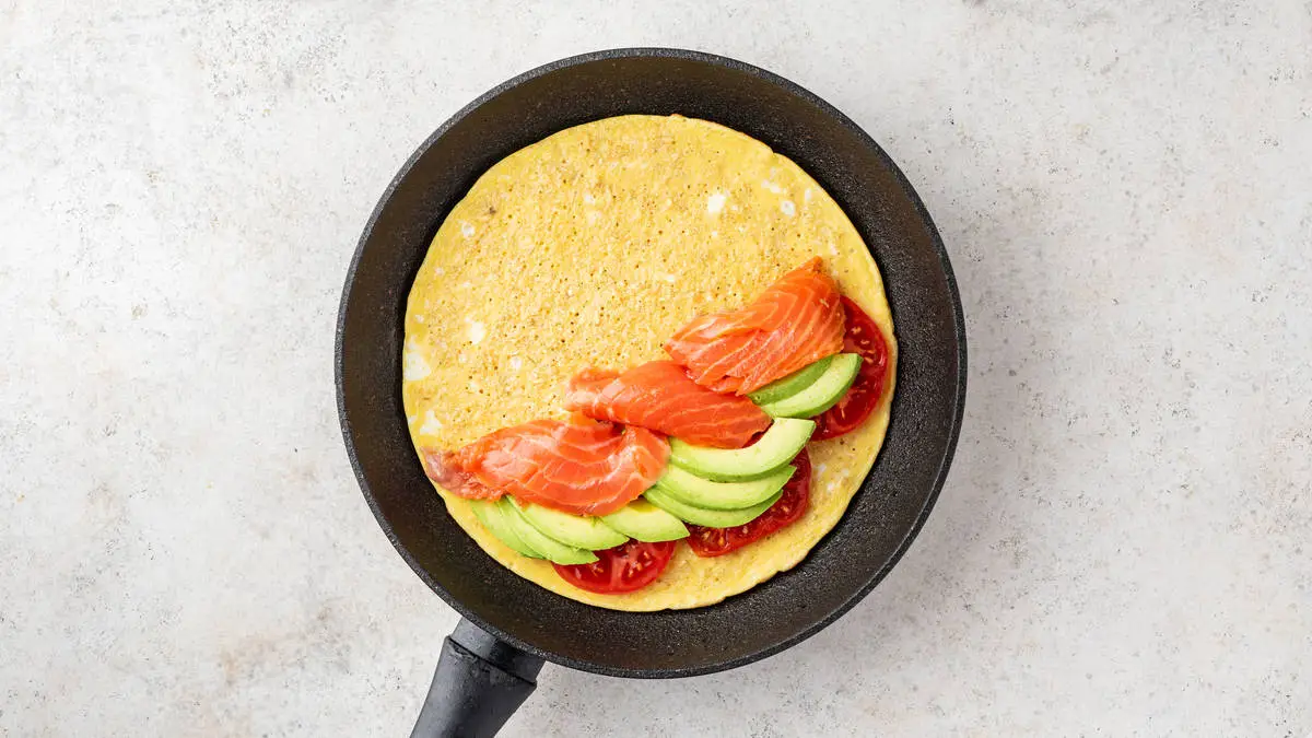 Не снимая с огня, выложите на половину блина начинку — нарезанный помидор, половинку авокадо, ломтики форели.