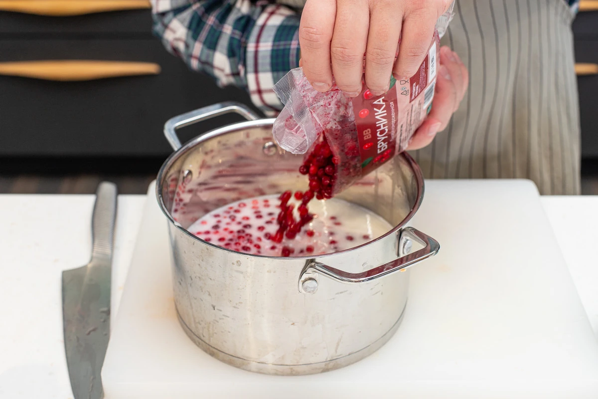 Процедите полученную массу. В получившуюся жидкость добавьте бруснику, сахар и кардамон, перемешайте. Кстати, вместо брусники вы можете добавить любые ягоды на ваш вкус: облепиху, красную или чёрную смородину, клубнику, малину и т.п.
