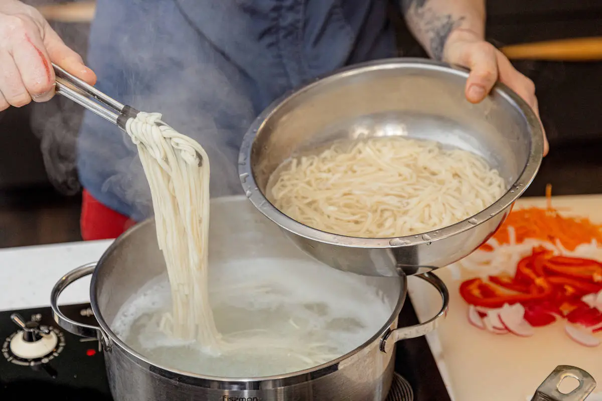 Отварите лапшу в 2 литрах подсоленной кипящей воды 3 минуты, переложите в холодную воду.