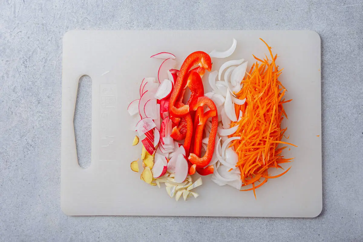Лук нарежьте перьями, морковь и сладкий перец — длинными тонкими ломтиками, редис — четвертинками. Чеснок измельчите, имбирь натрите.