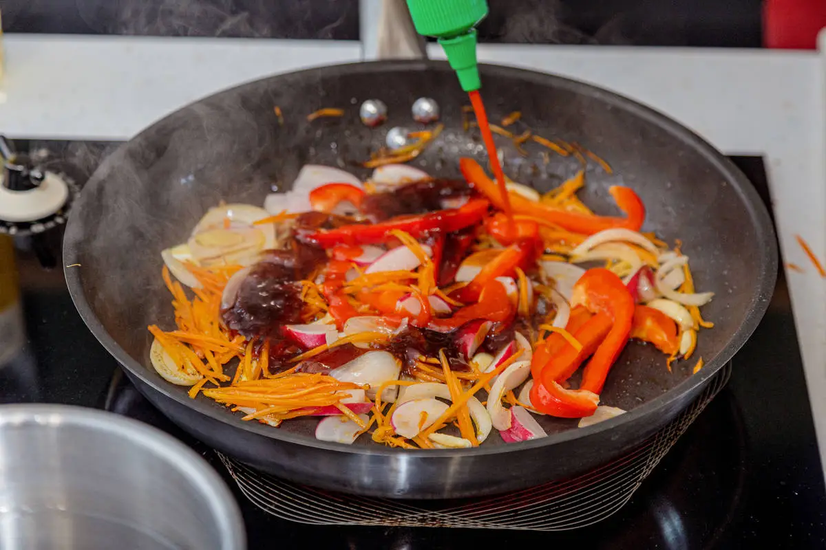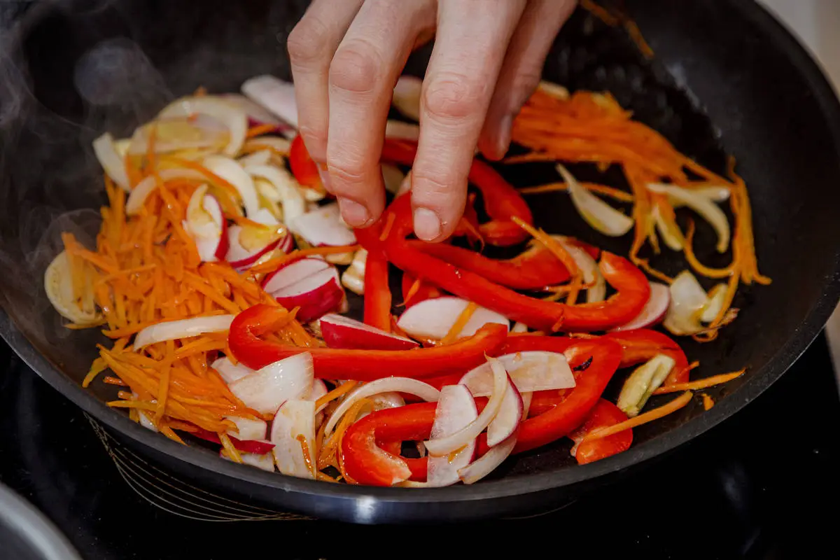 В большой сковороде (лучше всего подойдёт вок) обжарьте на сильном огне лук, морковь, чеснок и имбирь примерно полминуты, сразу добавьте перец и редиску.
