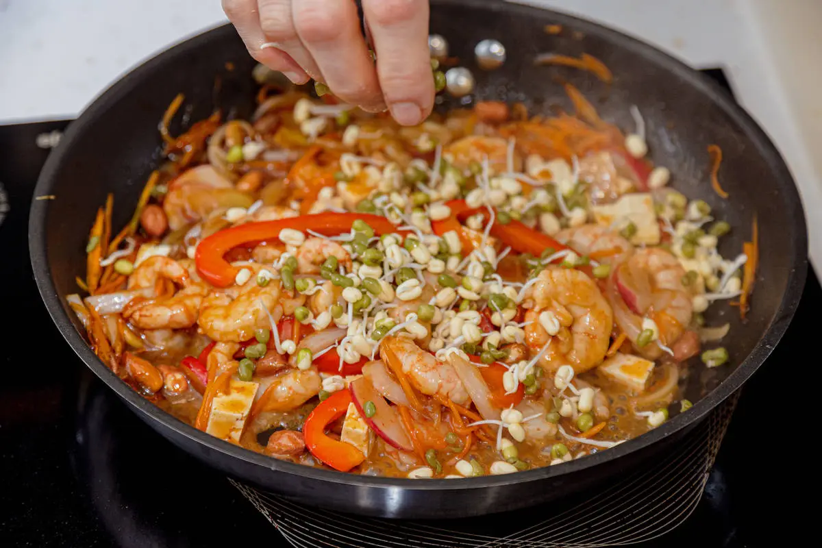 Как только креветки поменяют цвет, добавьте нарезанный кубиками тофу и арахис, перемешайте и снимайте с огня.