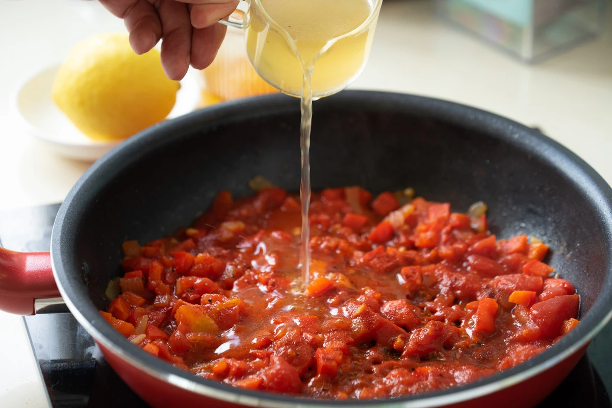 Измельчите лук и чеснок. Перец нарежьте кубиками. Разогрейте в сковороде оливковое масло, обжарьте лук до мягкости (примерно 3-4 минуты), добавьте чеснок и слега обжарьте на средне-слабом огне. Добавьте перец и тушите на среднем огне до мягкости в течение 7 минут. Добавьте томаты кубиками в собственном соку, приправьте солью, черным перцем и копчёной паприкой, тушите ещё 2-3 минуты, разбивая томаты лопаткой.
