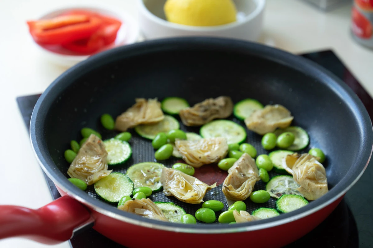 Эдамаме предварительно залейте горячей водой, чтобы разморозились. На отдельной сковороде или гриле обжарьте пару минут кружки цукини, добавьте артишоки и эдамаме и прогрейте ещё минуту.