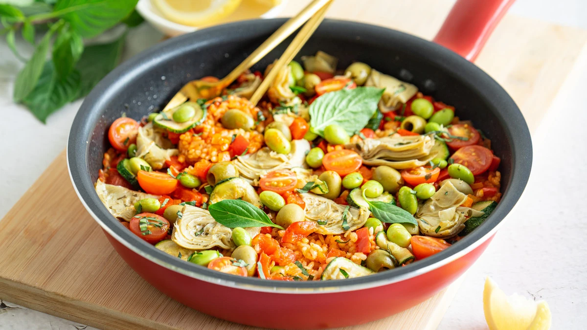 Паэлья для веганов и тех, кому хочется отдохнуть от мяса. Добавили в неё интересные продукты вроде артишоков на гриле, чтобы вы могли насладиться новыми оттенками вкуса в классическом блюде.