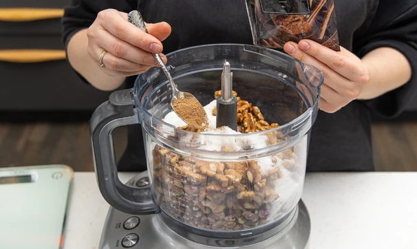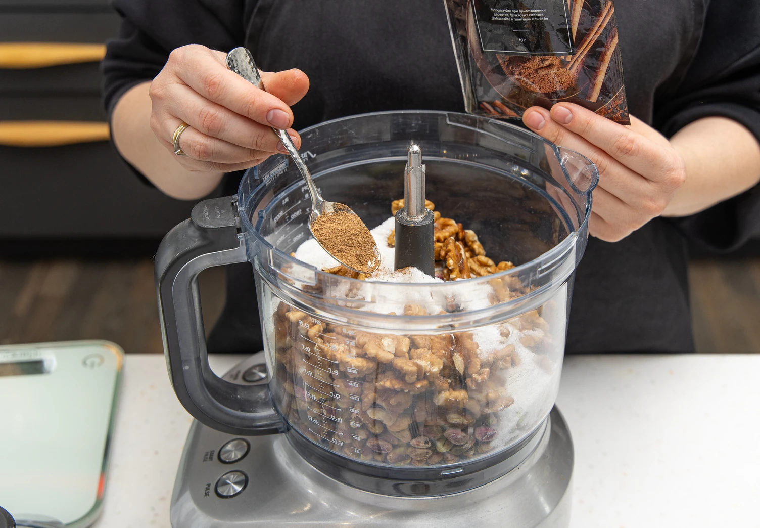 Измельчите фисташки и грецкий орех в блендере, добавив 150 г сахара и корицу. Следите за тем, чтобы масса не получилась порошкообразной.