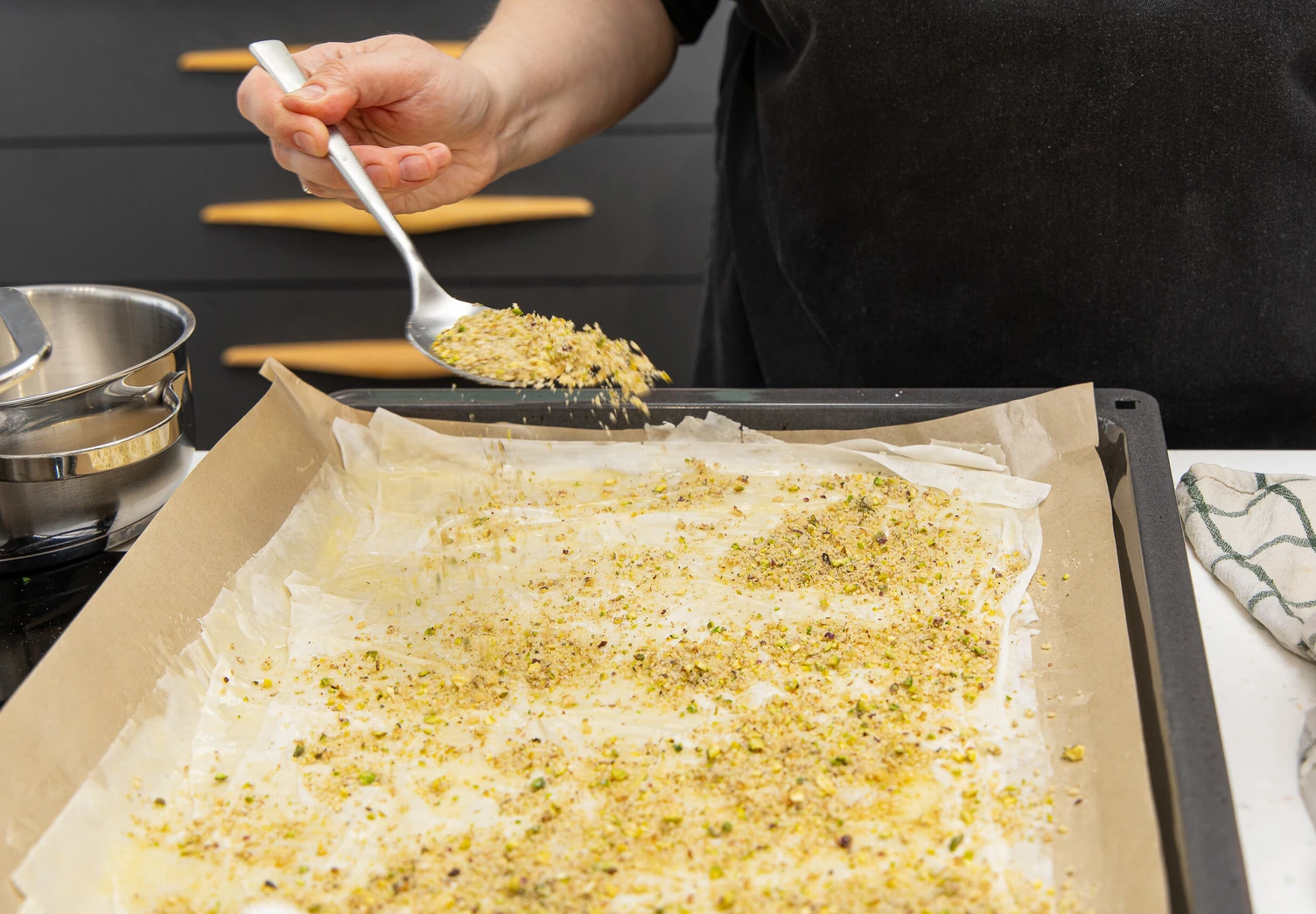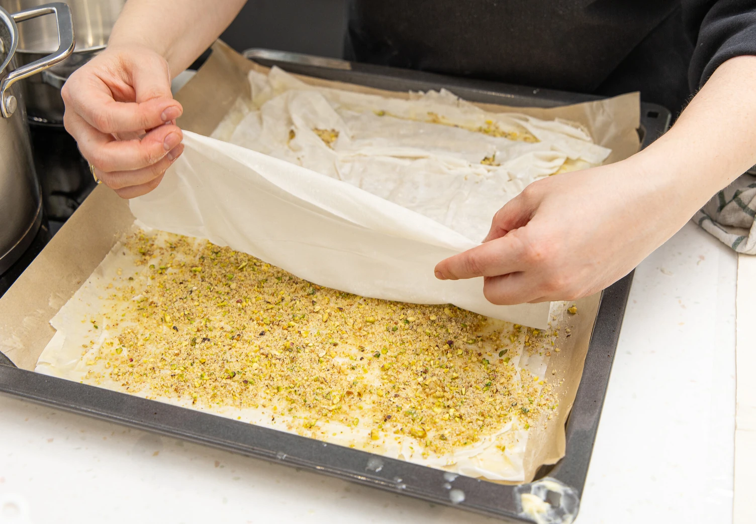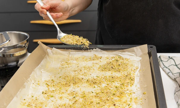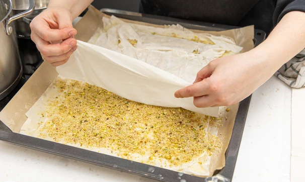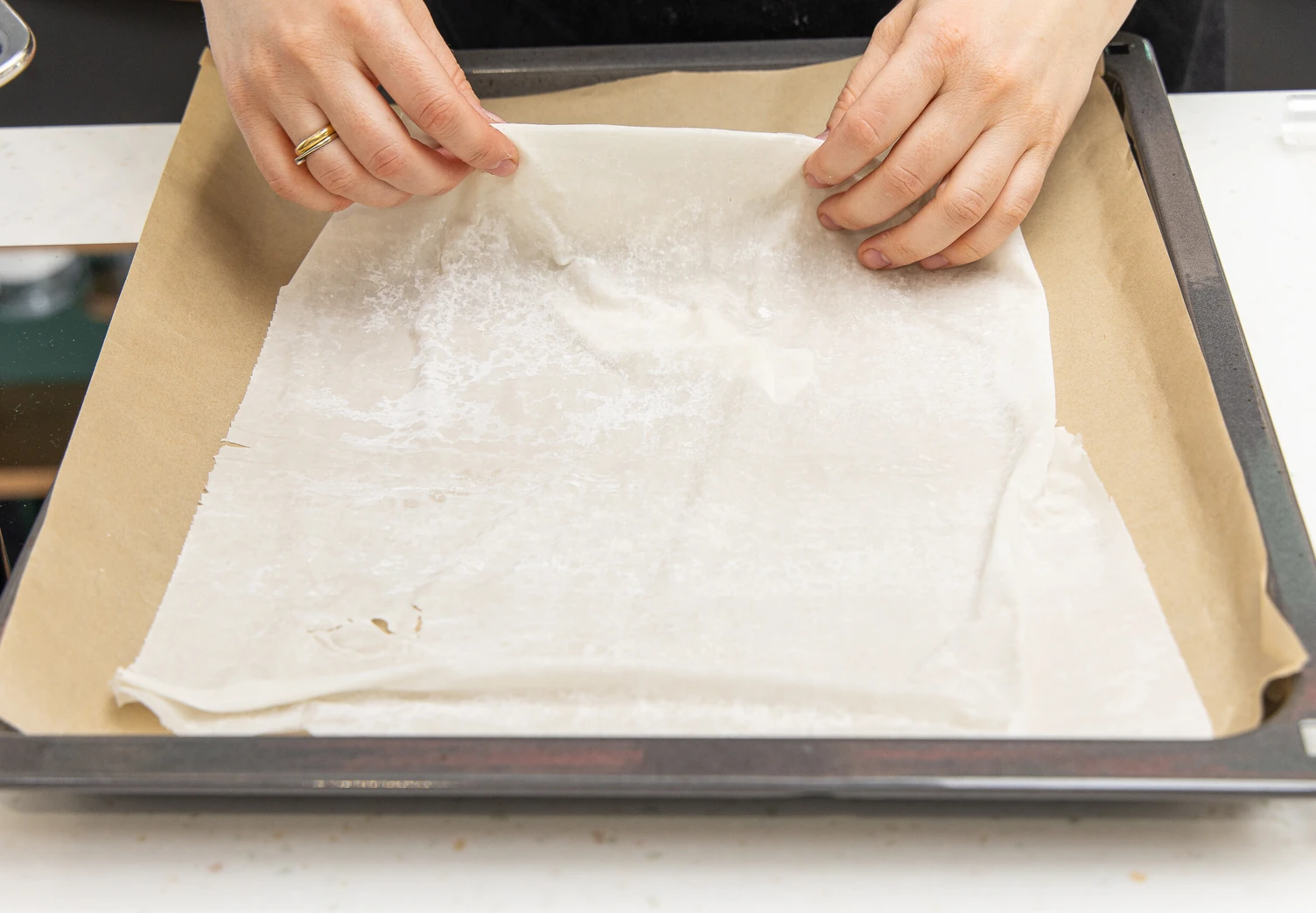 Разморозьте тесто фило по инструкции, разверните его на рабочей поверхности и накройте влажным кухонным полотенцем. Противень для пахлавы застелите пергаментом и смажьте растопленным сливочным маслом.