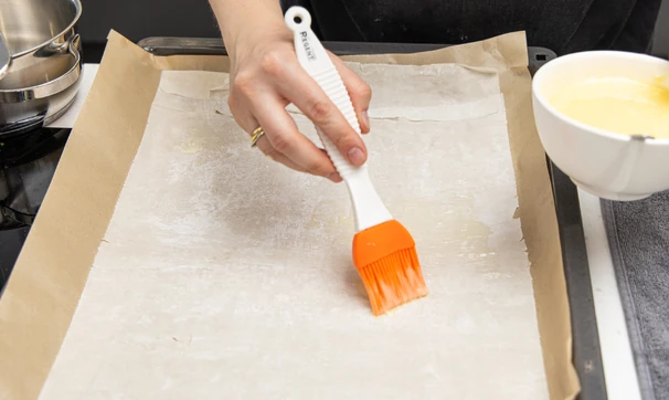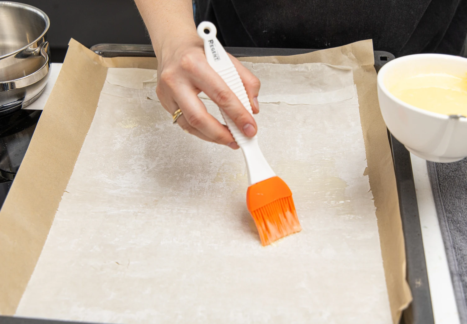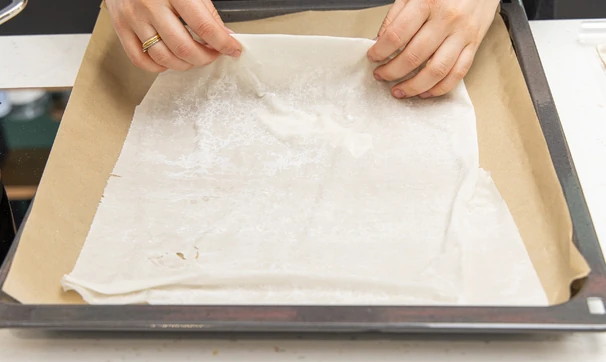 Аккуратно снимите полотенце с теста и начните отделять листы. Поместите один на противень и слегка смажьте маслом. Остальные листы теста в это время должны быть накрыты полотенцем.
