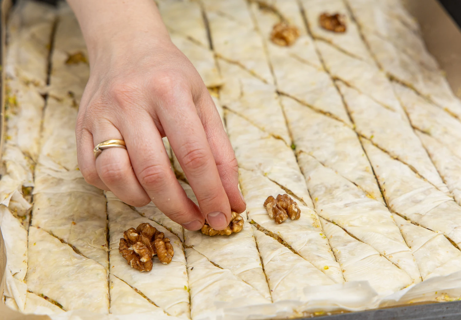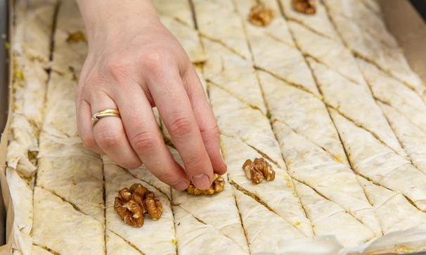 Украсьте оставшимися половинками грецких орехов и поставьте противень с пахлавой в духовку, разогретую до 180°C, на 40–45 минут.