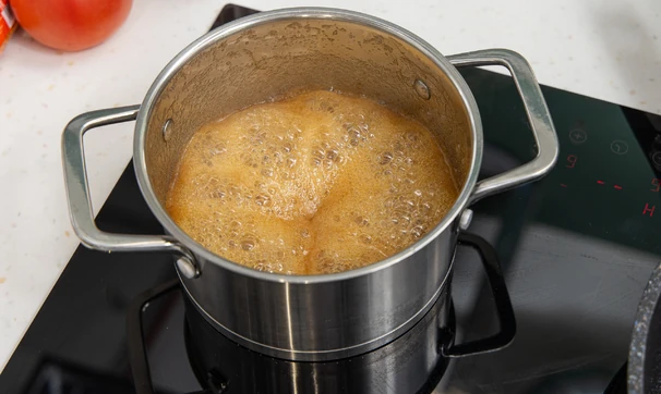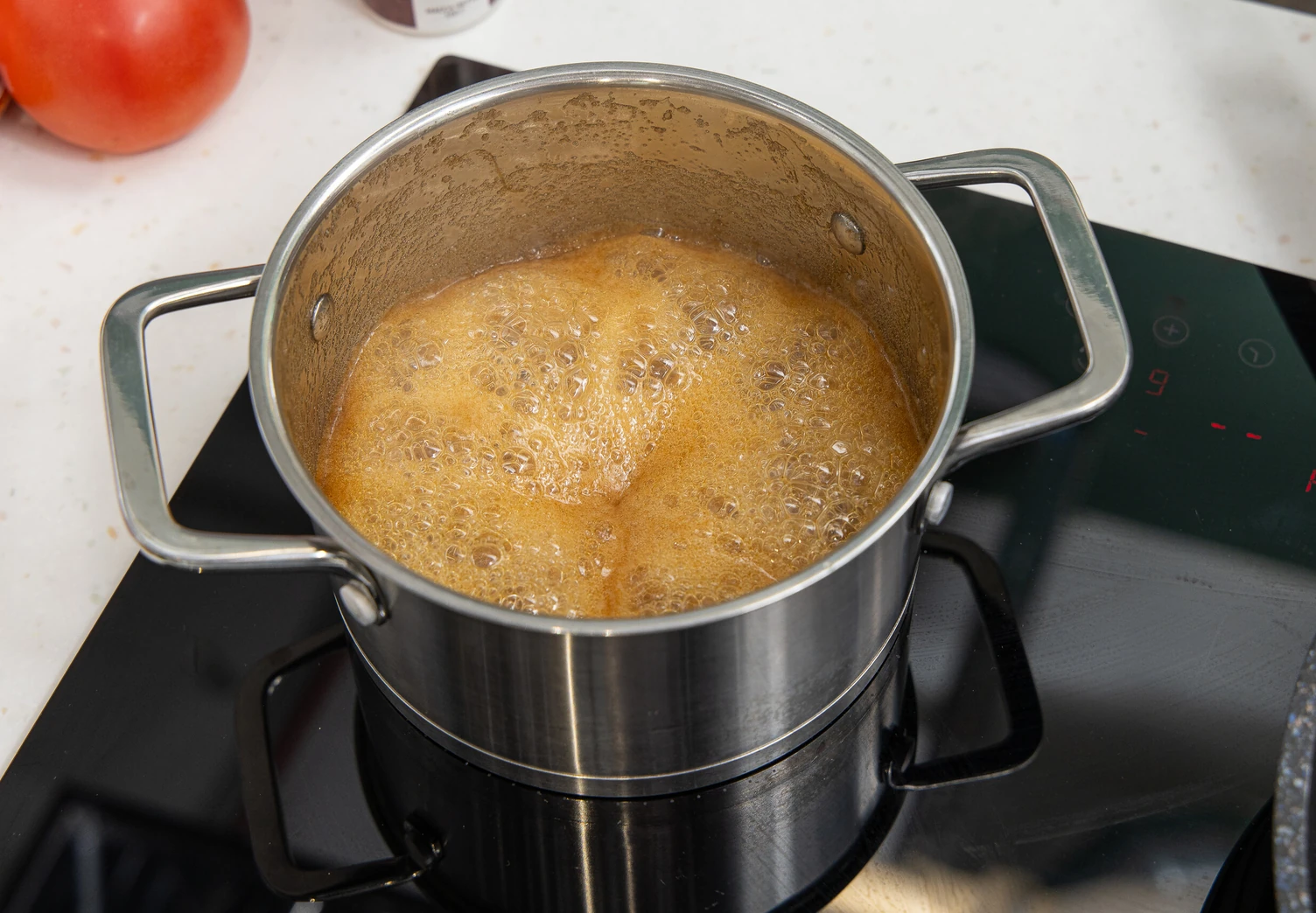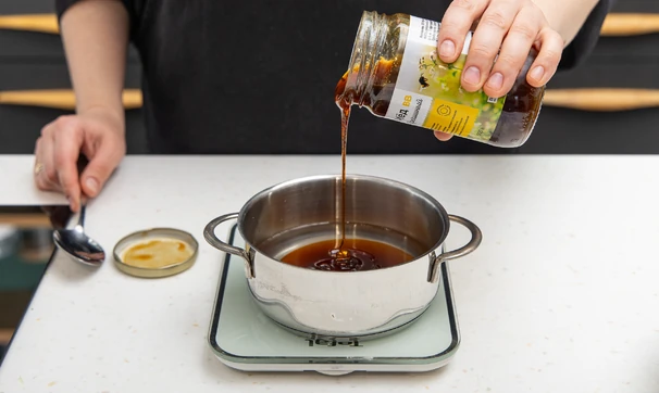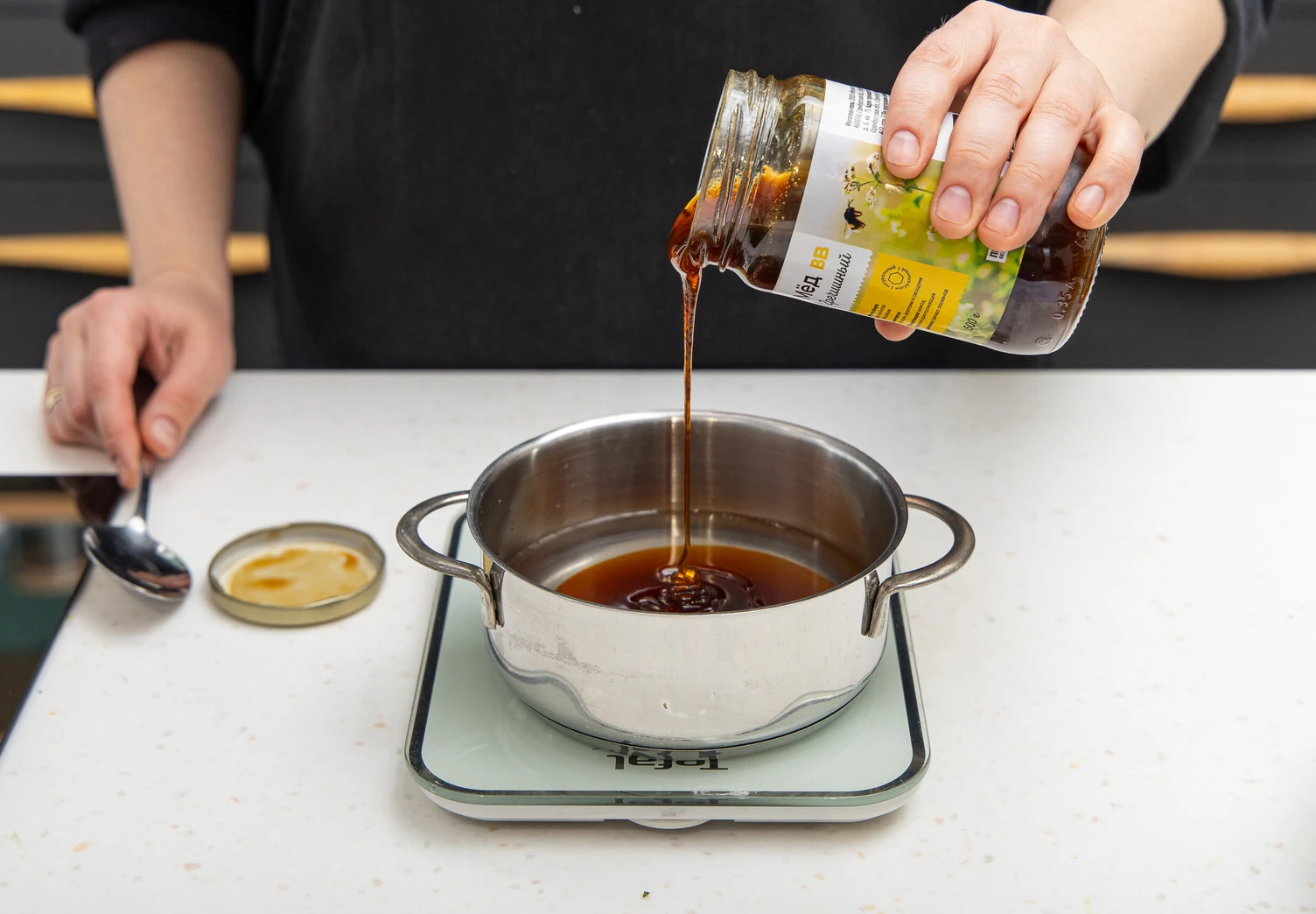 В сотейнике смешайте воду, 50 г сахара и мёд.