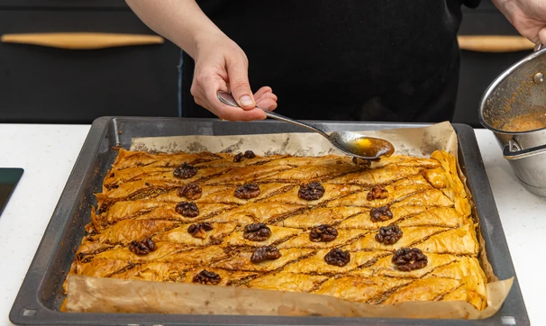 Достаньте пахлаву из духовки и полейте горячим сиропом.