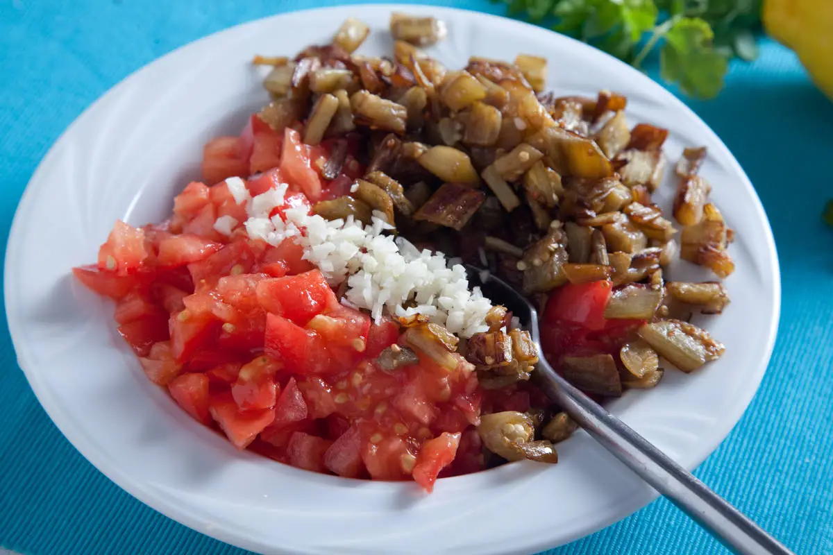Баклажаны слегка отожмите, нарежьте кубиками и обжарьте в оливковом масле. Готовые баклажаны соедините с порезанными помидорами, добавьте измельченный чеснок, мелко порезанный острый перец, кинзу и лимонный сок, перемешайте, посолите, если необходимо. На готовый горячий стейк выложите сальсу и сразу подавайте!