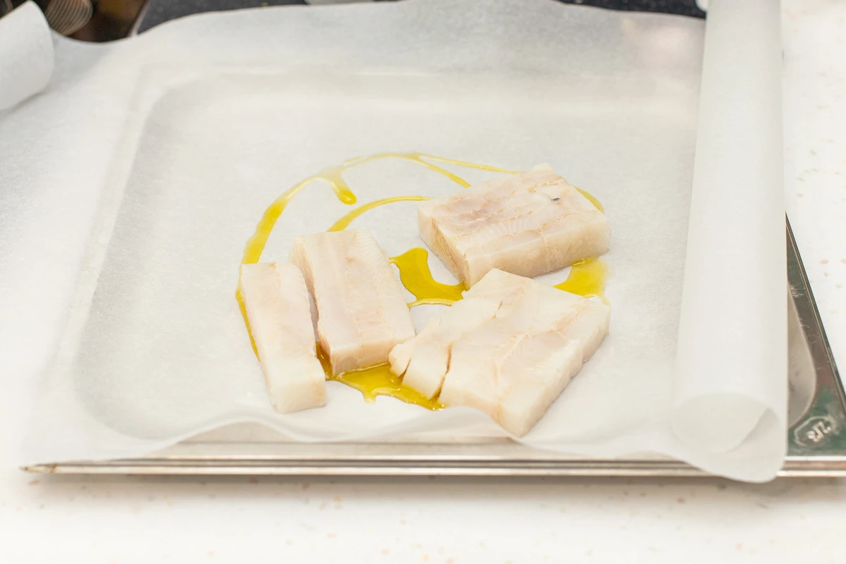 Разморозьте филе палтуса. На пергамент выложите филе, полейте оливковым маслом.