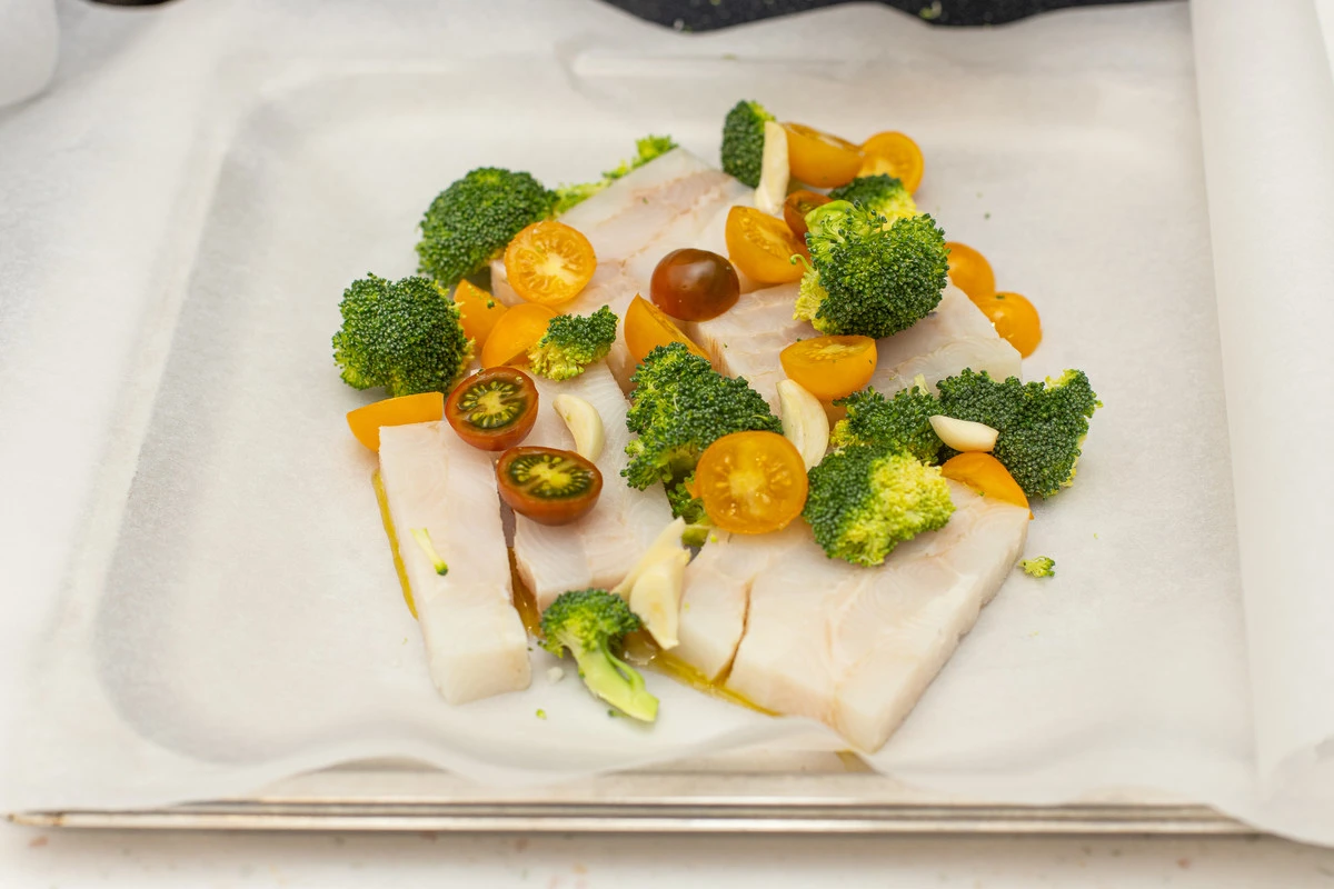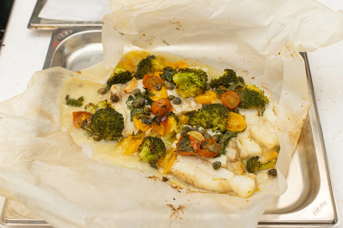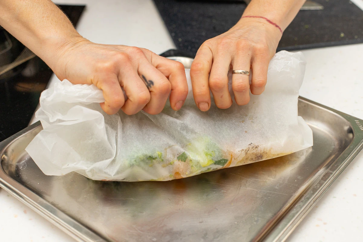 Раскройте пергамент и разложите рыбу с овощами по тарелкам.